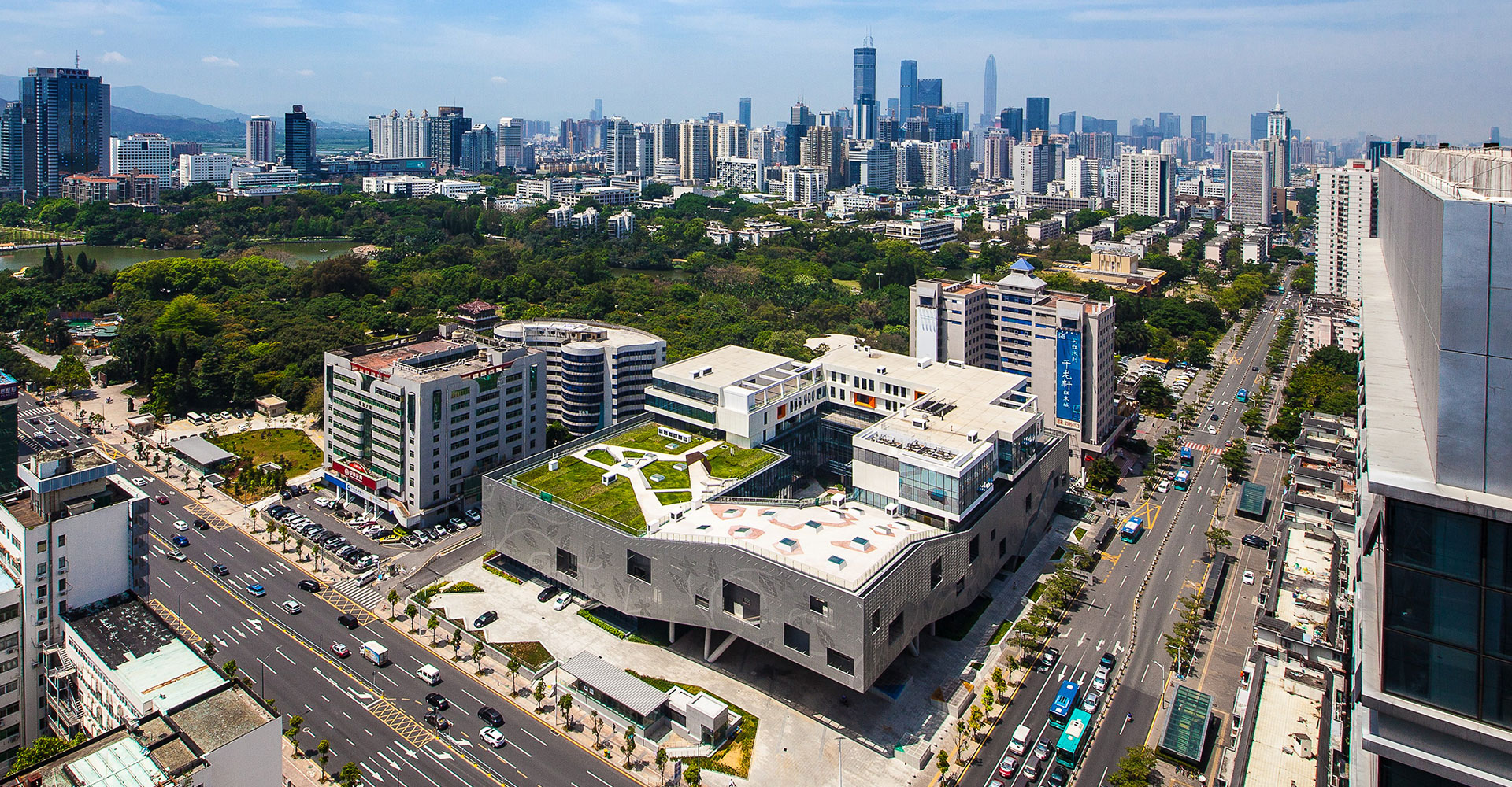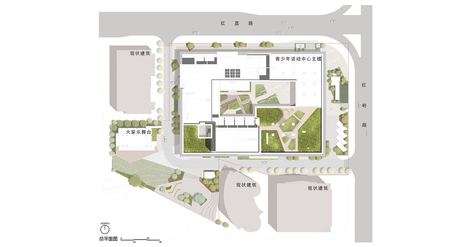 深圳青少年活動中心改擴建項目將建設(shè)成為“與國際化創(chuàng)新型城市相適應(yīng)的公益性、綜合性、現(xiàn)代化,面向全市14-28歲青少年服務(wù)的社會教育綠色基地。項目分兩期建造,一期為大家樂舞臺及變配電室,二期為青少年活動中心主樓。用地近似為平地,無高差。用地被基地內(nèi)現(xiàn)狀道路切割為兩部分,主樓建筑位于用地較完整的東北側(cè),東側(cè)和北側(cè)均貼臨城市干道。用地的西南角為大家樂舞臺及變配電室。