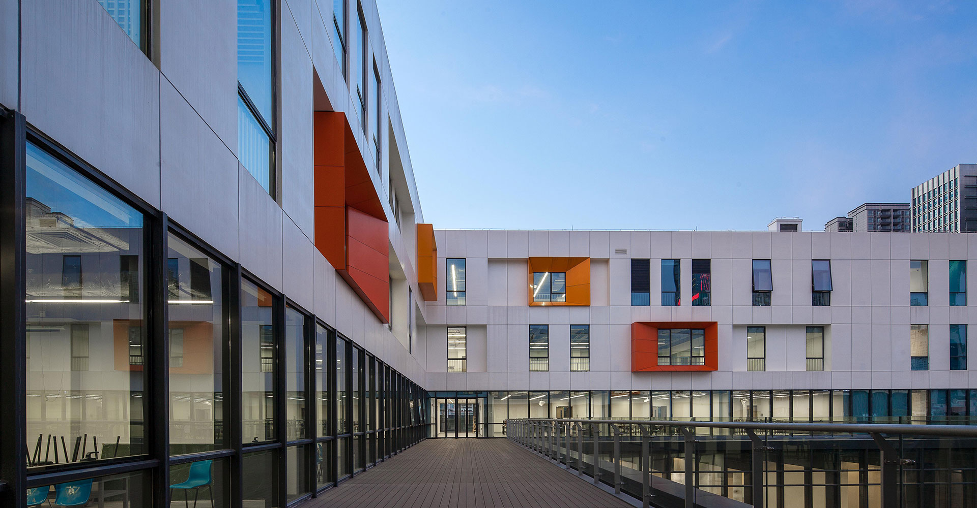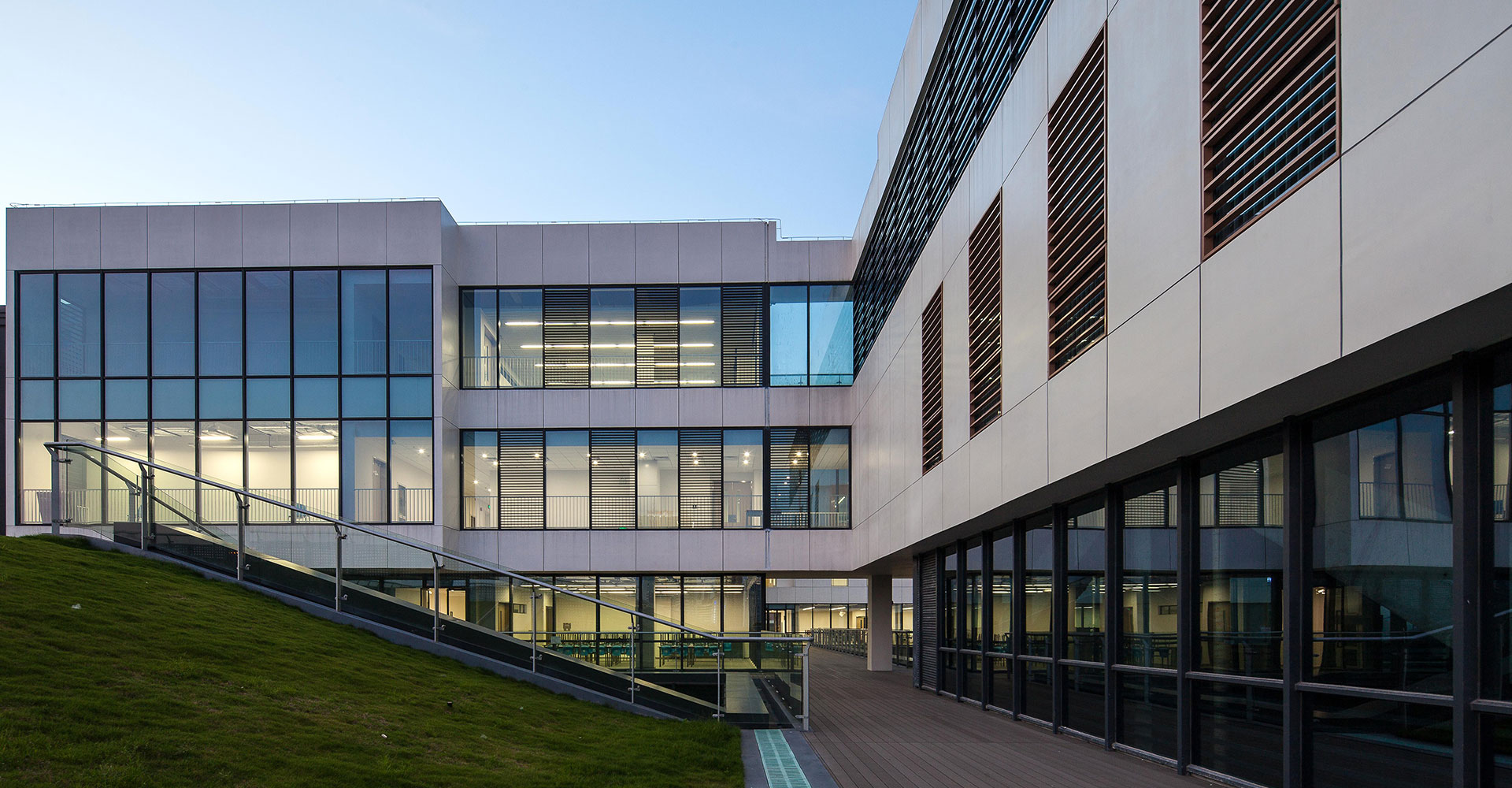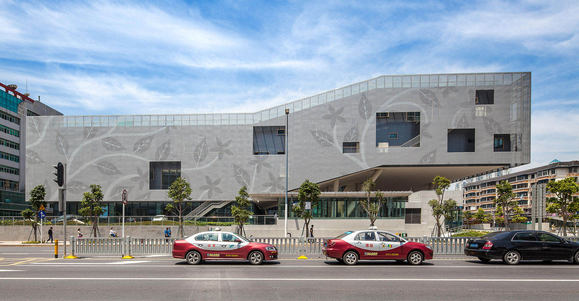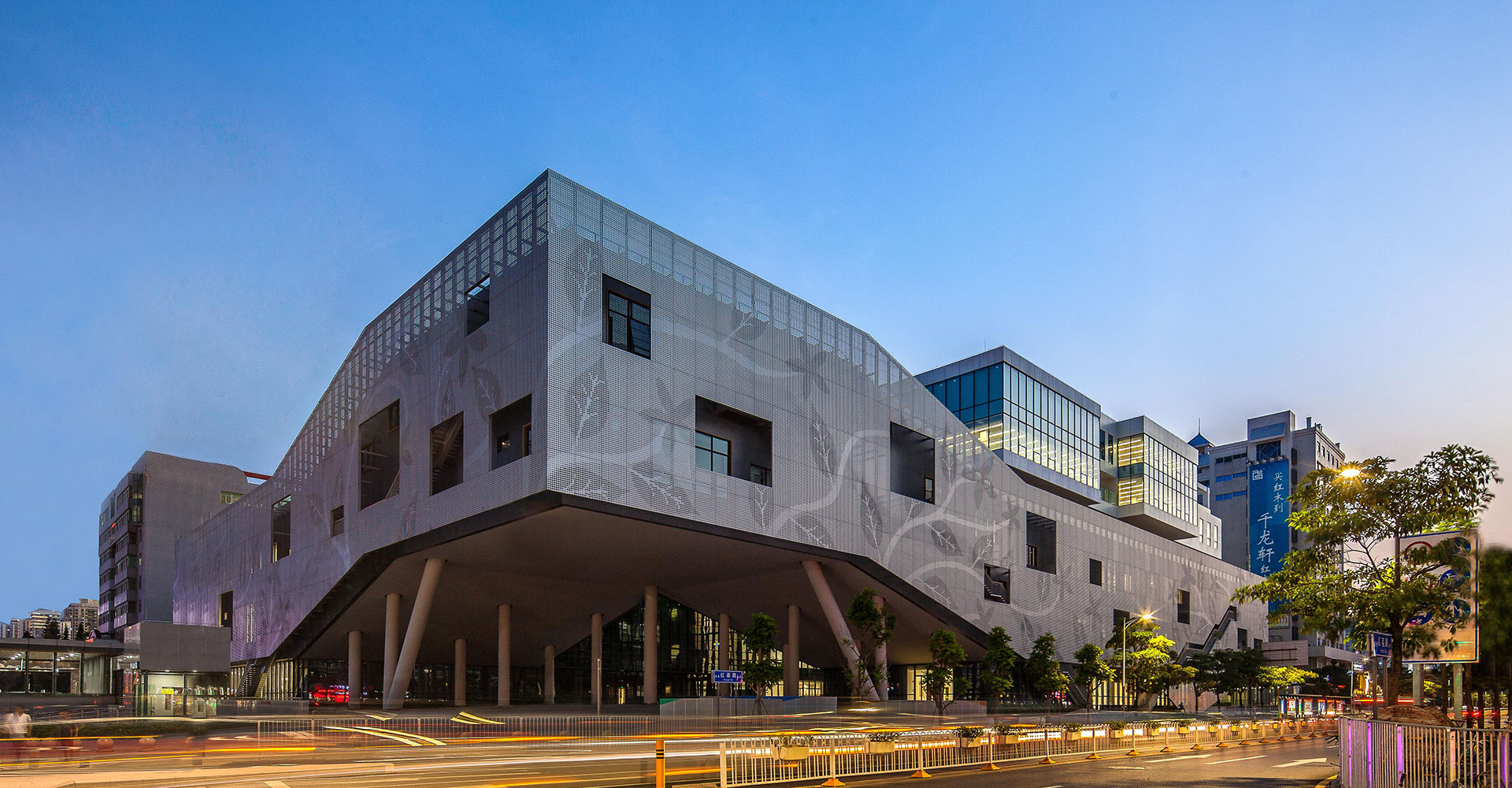 2-3層從建筑外墻外挑2米鋼結(jié)構(gòu)外掛沖孔鋁板幕墻,鋁板與外墻之間設(shè)豎向樓梯,解決2-3層展陳的疏散,為室內(nèi)營造大空間提供了條件,鋁板幕墻還起到垂直擋板遮陽和隔音的效果。