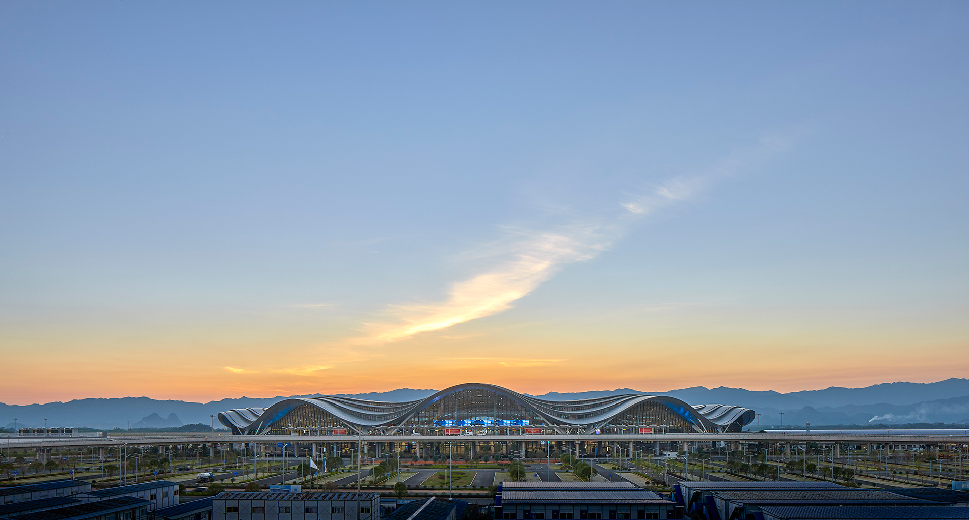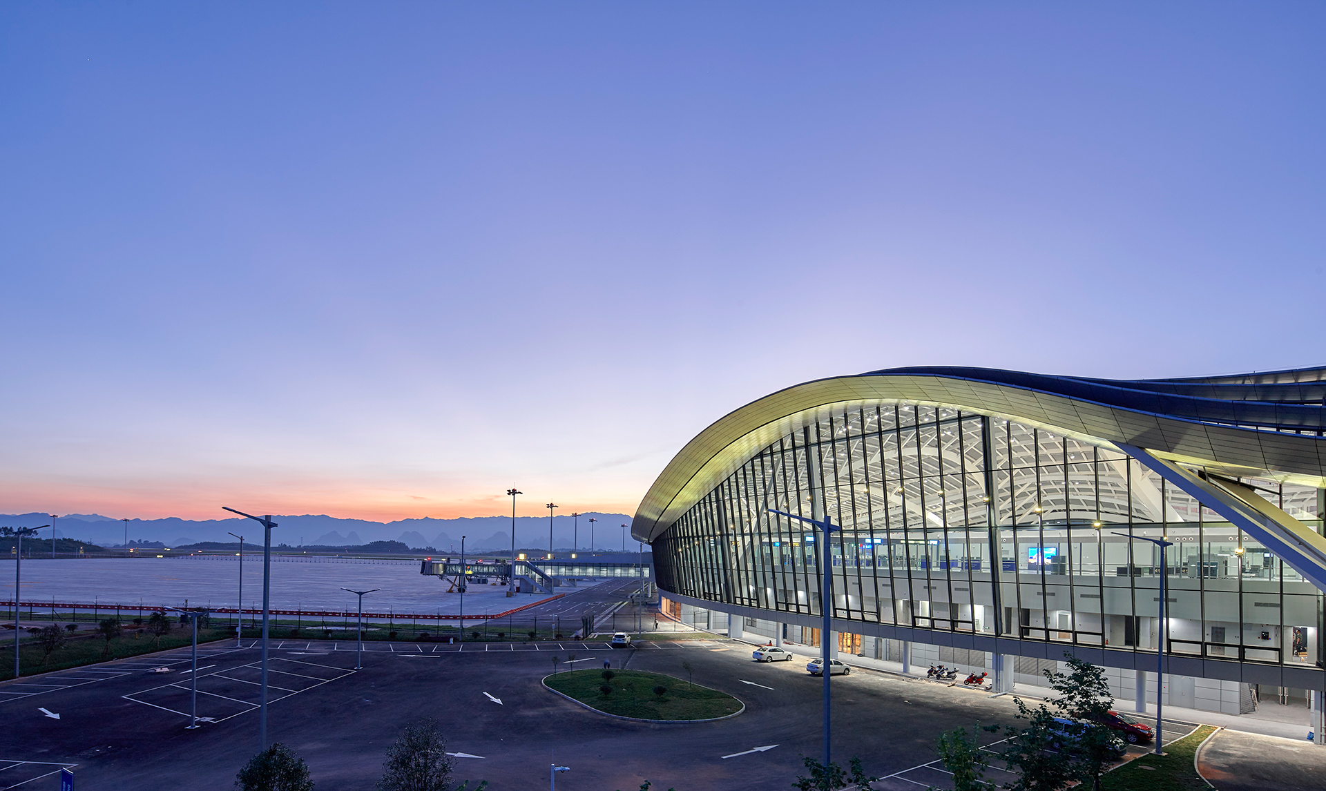 廣西桂林國(guó)際機(jī)場(chǎng)T2航站樓,為廣西壯族自治區(qū)面向“一帶一路”的重點(diǎn)建設(shè)項(xiàng)目。航站樓總面積約十萬(wàn)平米。地上三層,地下設(shè)置一層管廊層。建筑為U字型布局,東西長(zhǎng)約353米,南北寬約372米。建成后旅客年吞吐量850萬(wàn)人次。