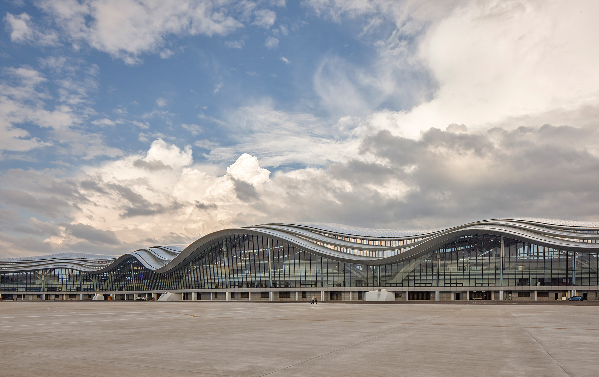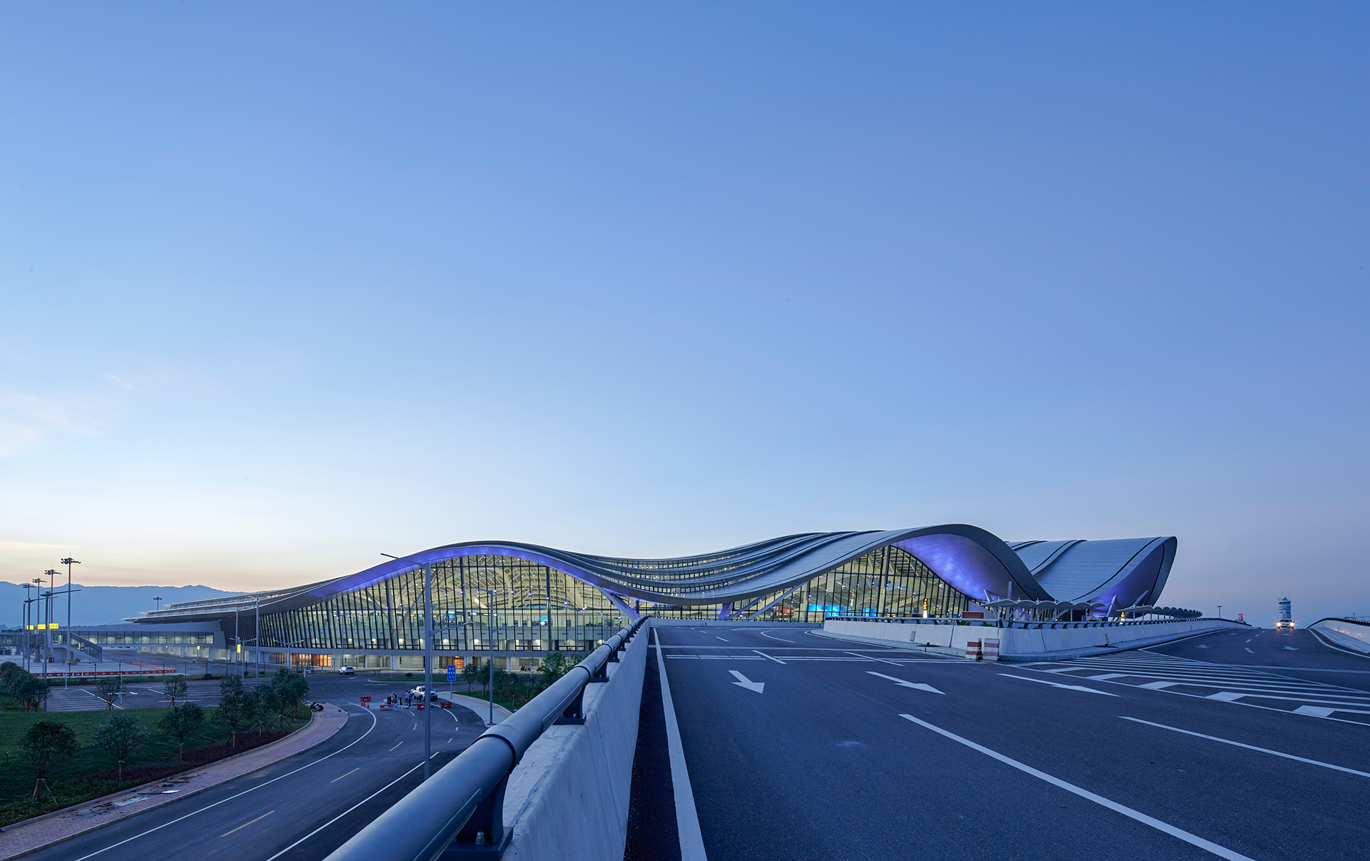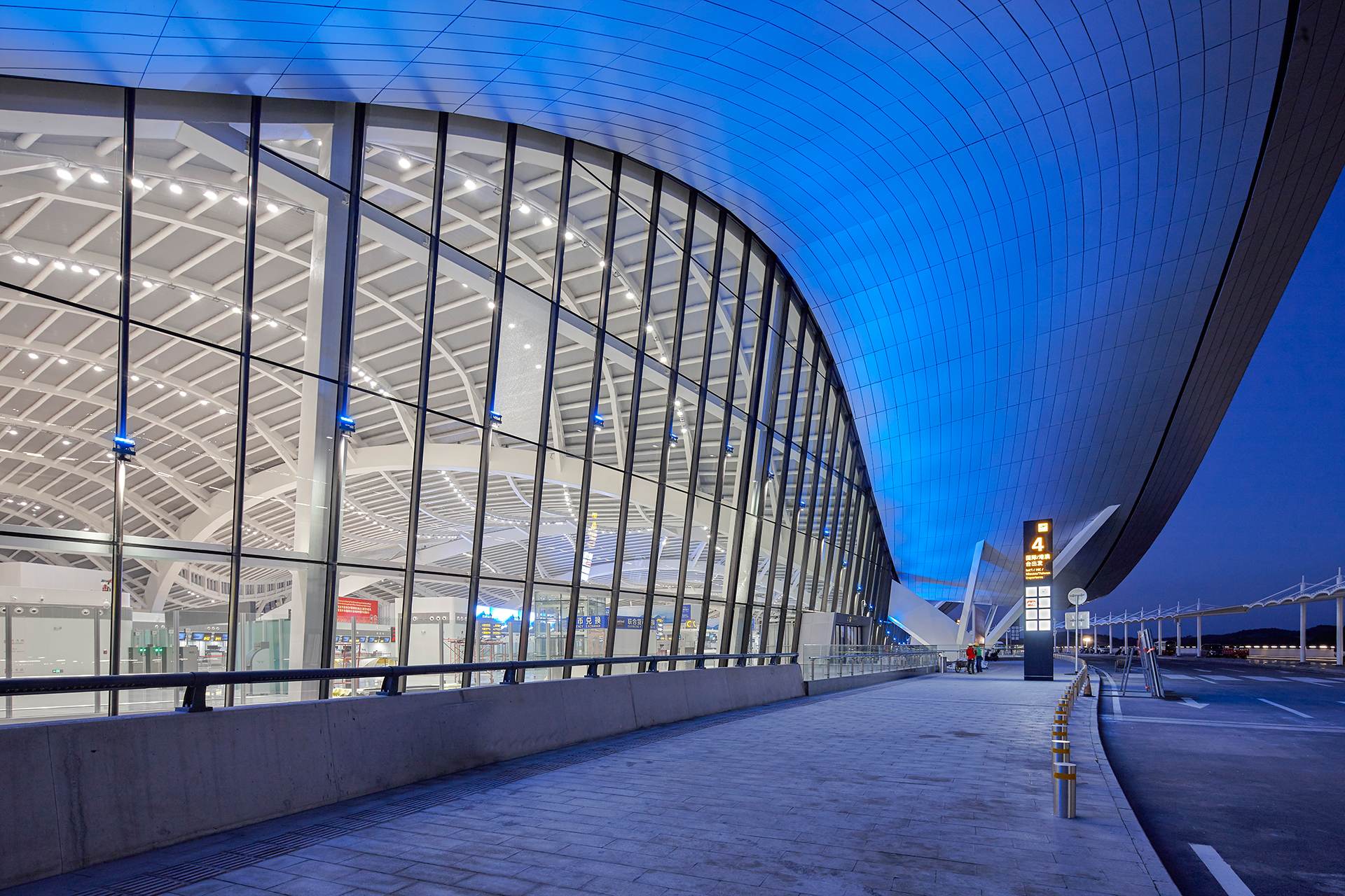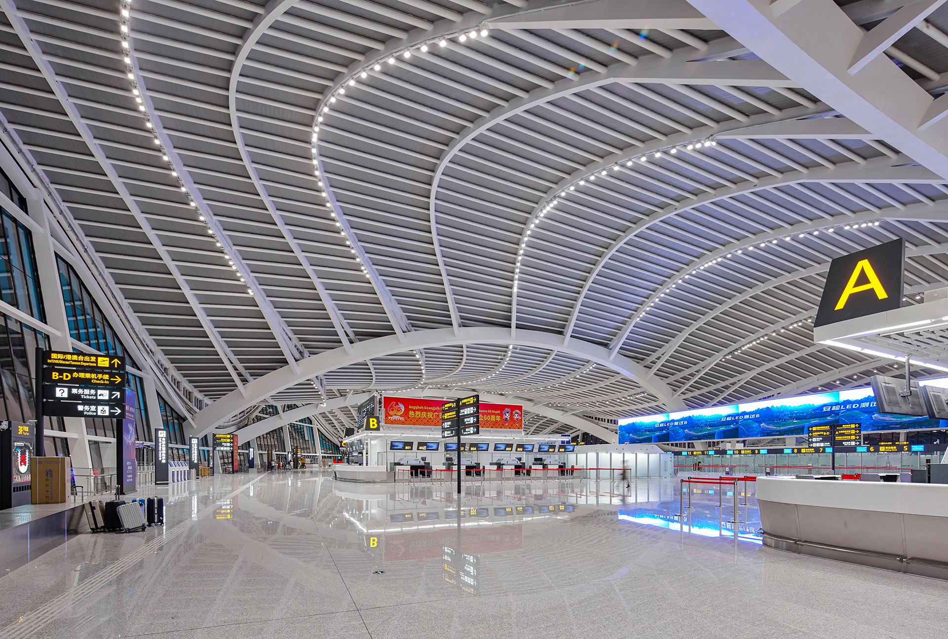 本項(xiàng)目五個(gè)連續(xù)起伏的拱形曲面與建筑內(nèi)部空間序列對(duì)應(yīng),成對(duì)的傾斜拱形支撐實(shí)現(xiàn)整個(gè)離港層大跨度的連續(xù)無(wú)柱空間。豎向分格的超白玻璃幕墻沿建筑立面展開,首層采用氟碳噴涂鋁單板幕墻。屋頂采用單層拱殼結(jié)構(gòu)以多榀傾斜拱為骨架,,頂部覆蓋金屬屋面系統(tǒng),通過(guò)建筑結(jié)構(gòu)一體化設(shè)計(jì),結(jié)構(gòu)構(gòu)件直接成為室內(nèi)裝飾要素。屋面創(chuàng)新采用輕型金屬屋面與卷材防水和金屬裝飾板結(jié)合的屋面構(gòu)造系統(tǒng),實(shí)現(xiàn)了結(jié)構(gòu)底板作為裝飾板、屋面防水與裝飾雙層構(gòu)造等多方面的創(chuàng)新,并申請(qǐng)相關(guān)專利,實(shí)現(xiàn)了良好的防水性能及自然的金屬質(zhì)感和連續(xù)平滑的曲面效果。