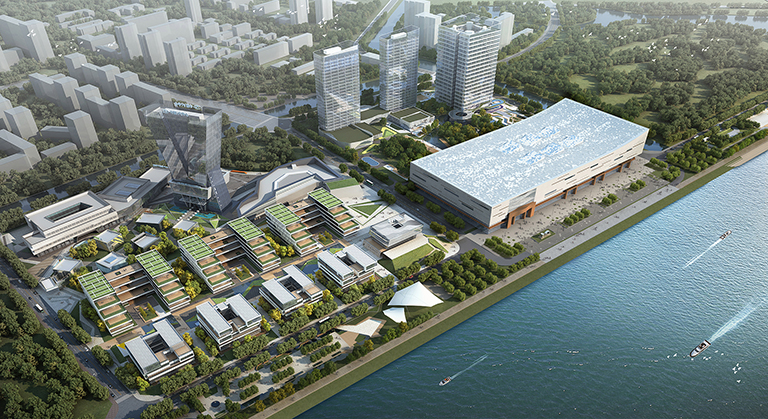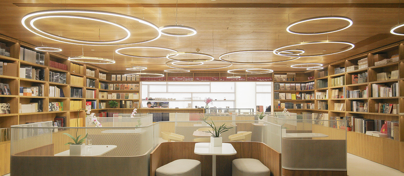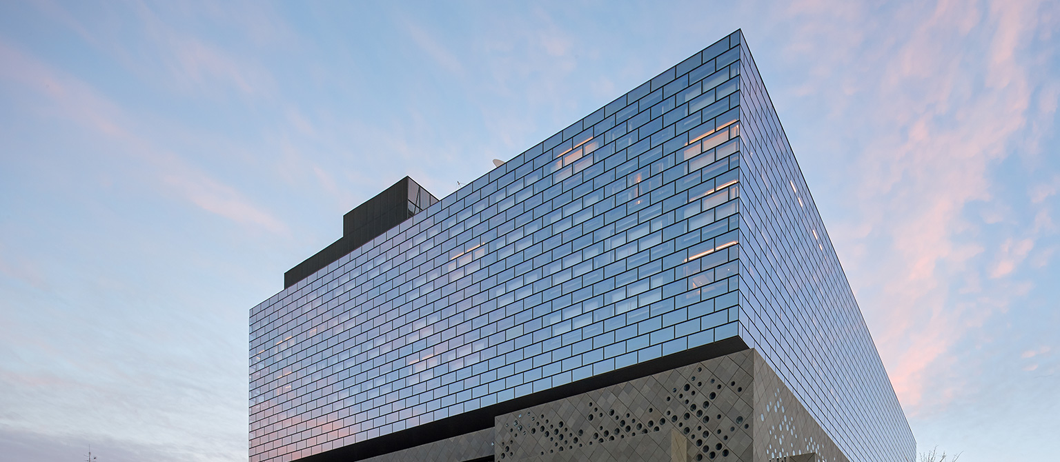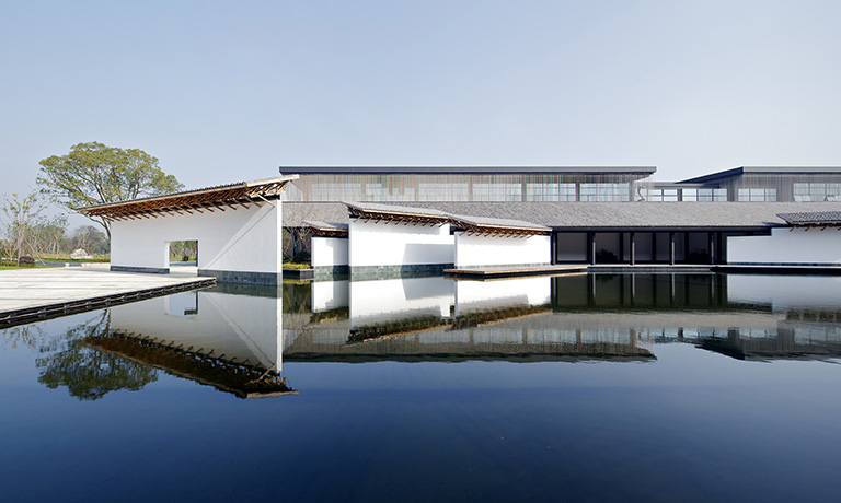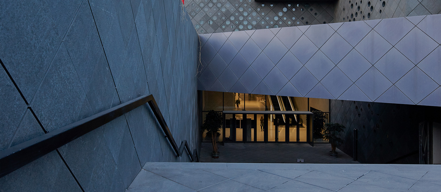 外幕墻首層至四層為菱形間隔單元式石材幕墻系統(tǒng),上部4-8層外立面為錯縫玻璃幕墻預(yù)制型小單元系統(tǒng)。圓形雙面玻璃鏡筒內(nèi)置LED燈鑲嵌在深灰色石材幕墻上,抽象的呈現(xiàn)了中國元代畫家黃公望的富春山居圖。