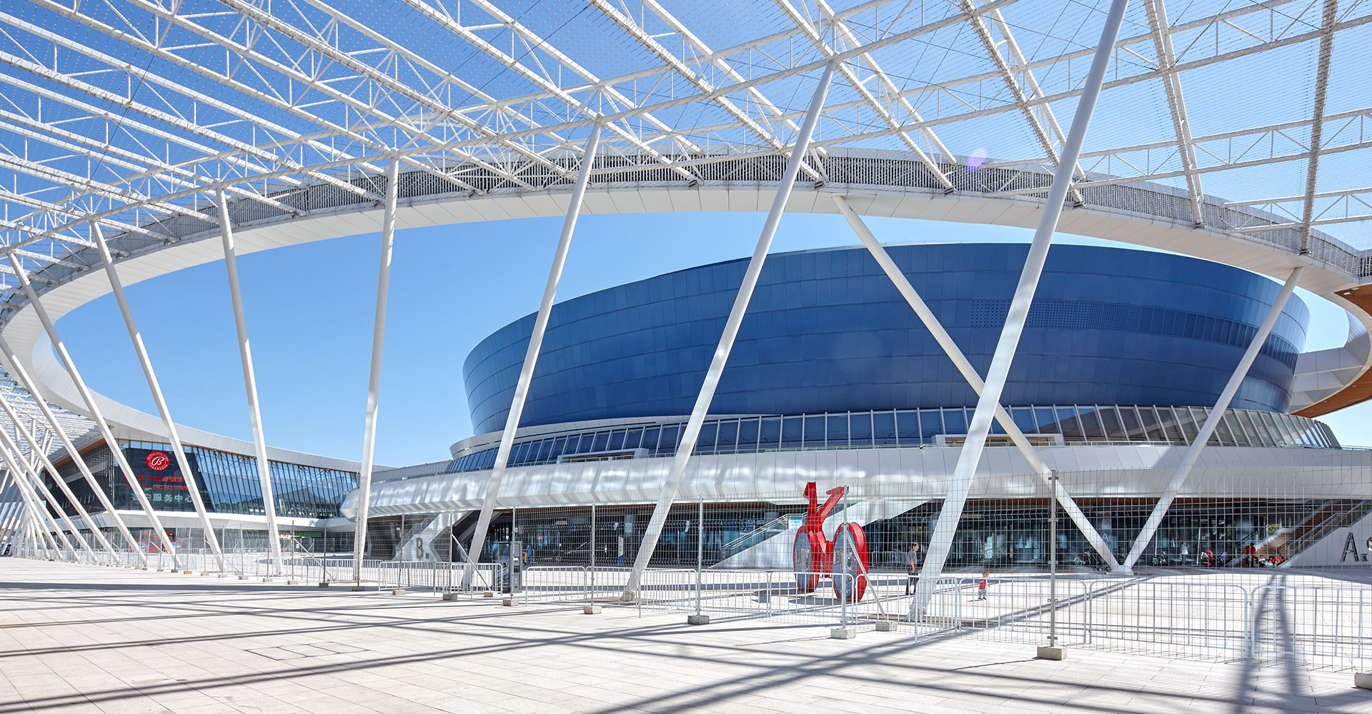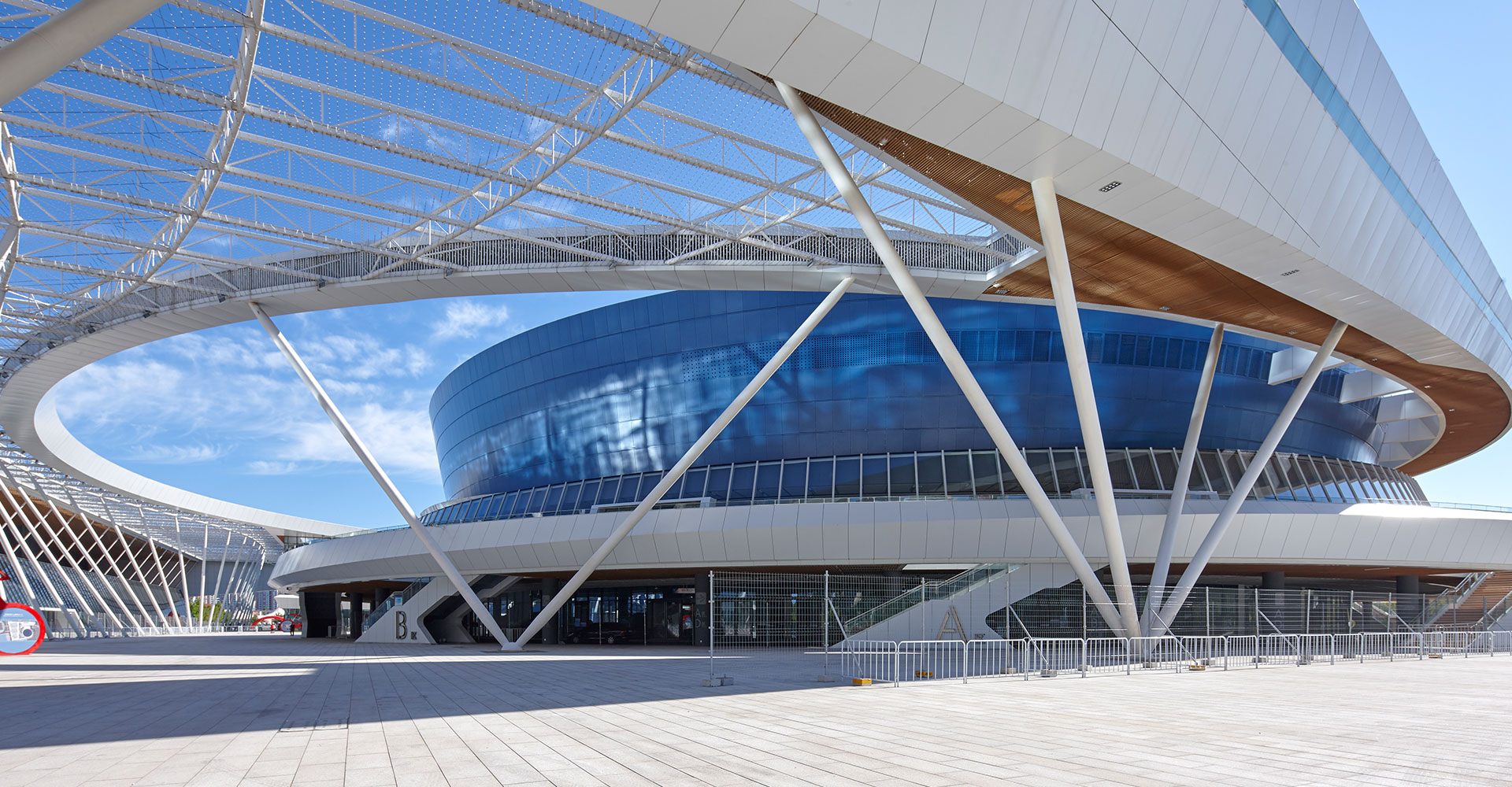 強(qiáng)調(diào)多個(gè)單體的體育建筑從功能到形式上的整合,同時(shí)將場(chǎng)館間的相對(duì)消極的空間通過(guò)半室外化的空間營(yíng)造,嘗試變?yōu)榉e極的活動(dòng)空間,并與城市空間相對(duì)接。在后期實(shí)際運(yùn)營(yíng)期間,功能一體化為使用帶來(lái)了很大的便利、空間一體化帶來(lái)了鮮明而有力的建筑形態(tài)、建筑虛空成為了提升使用者感受的“亮點(diǎn)空間”。