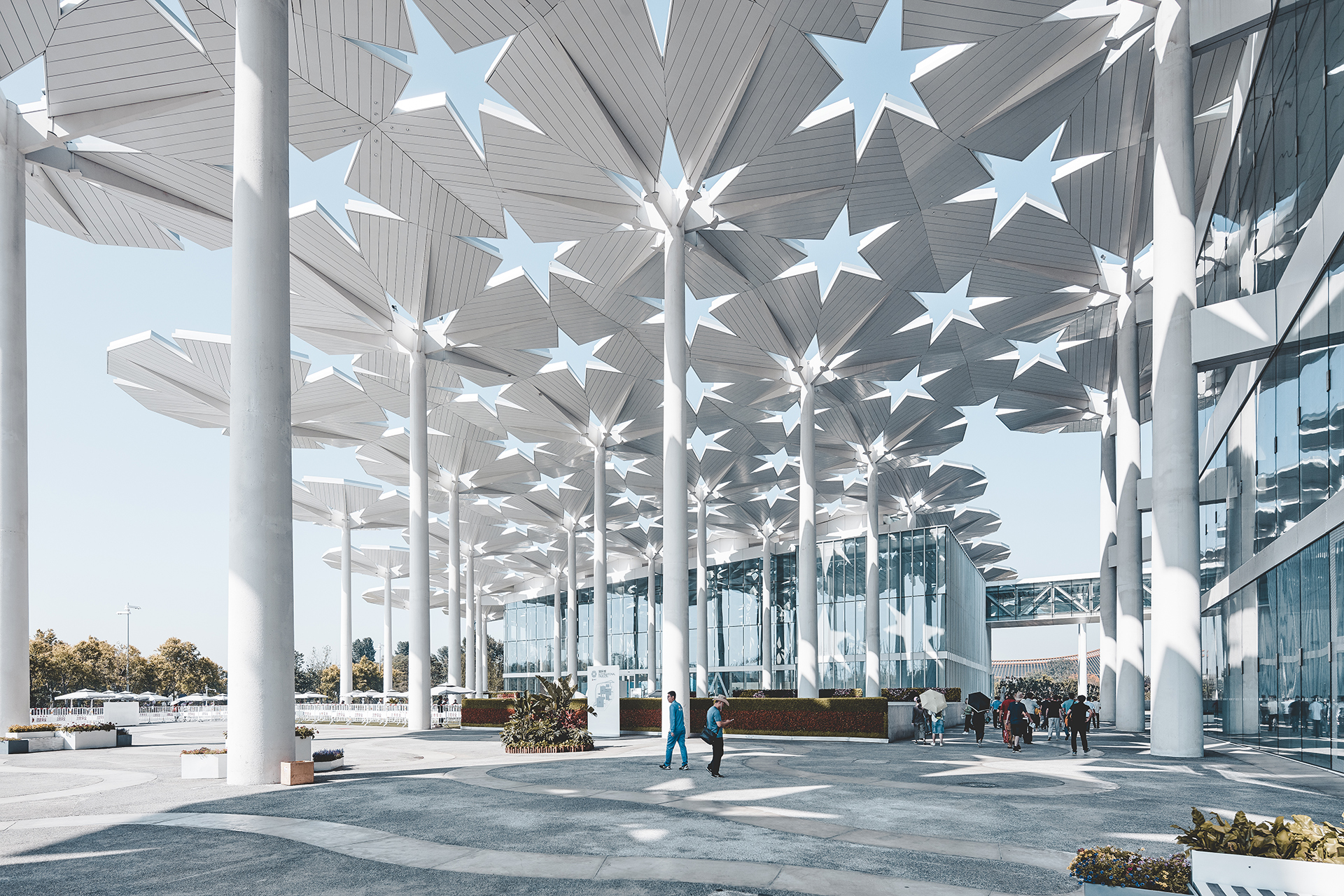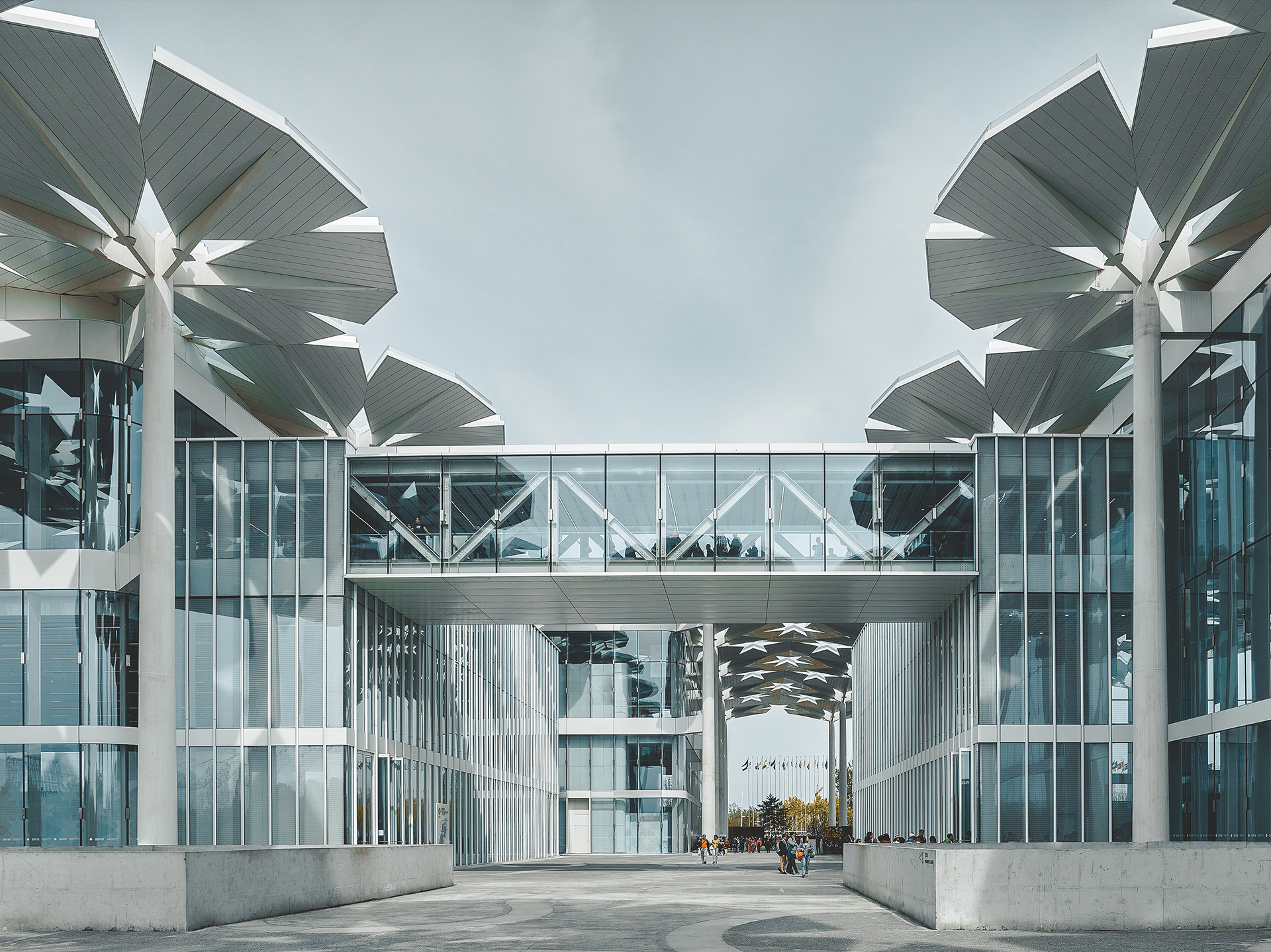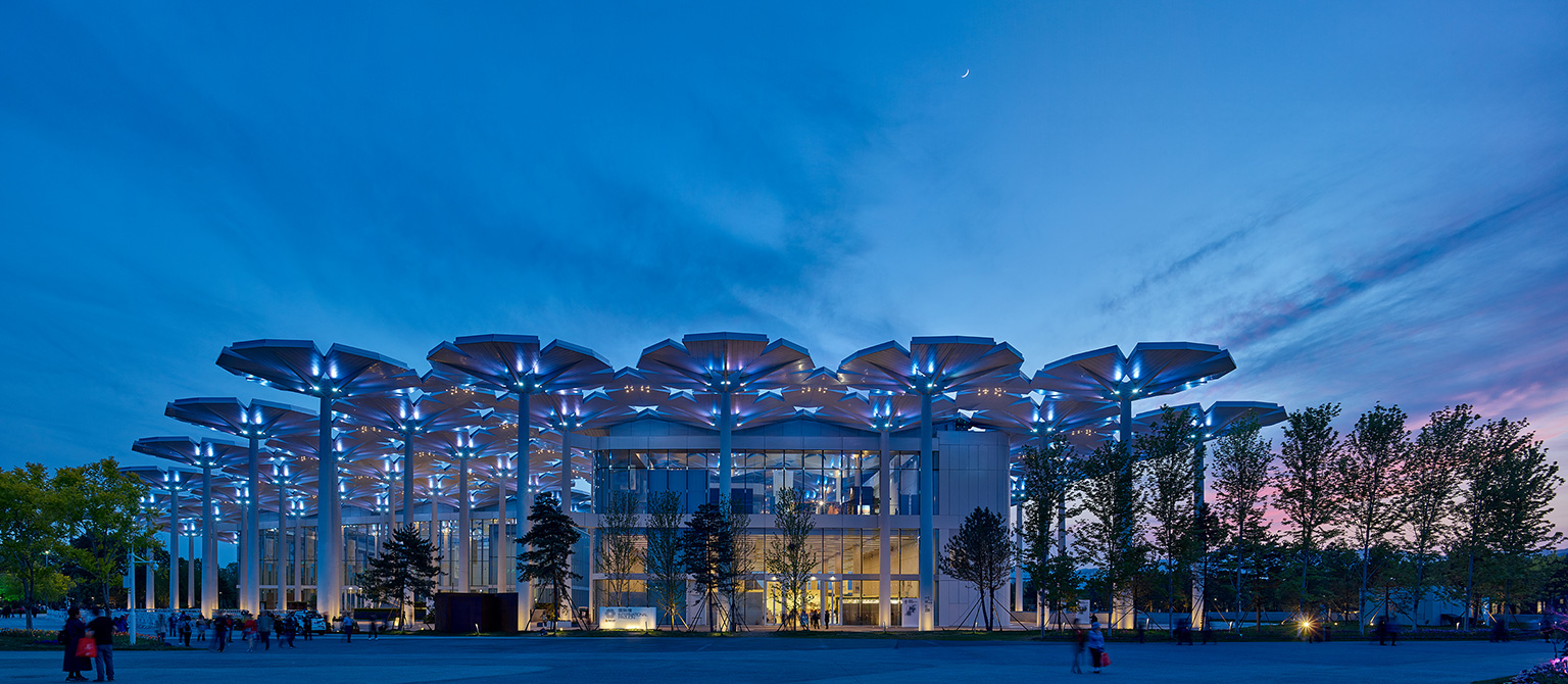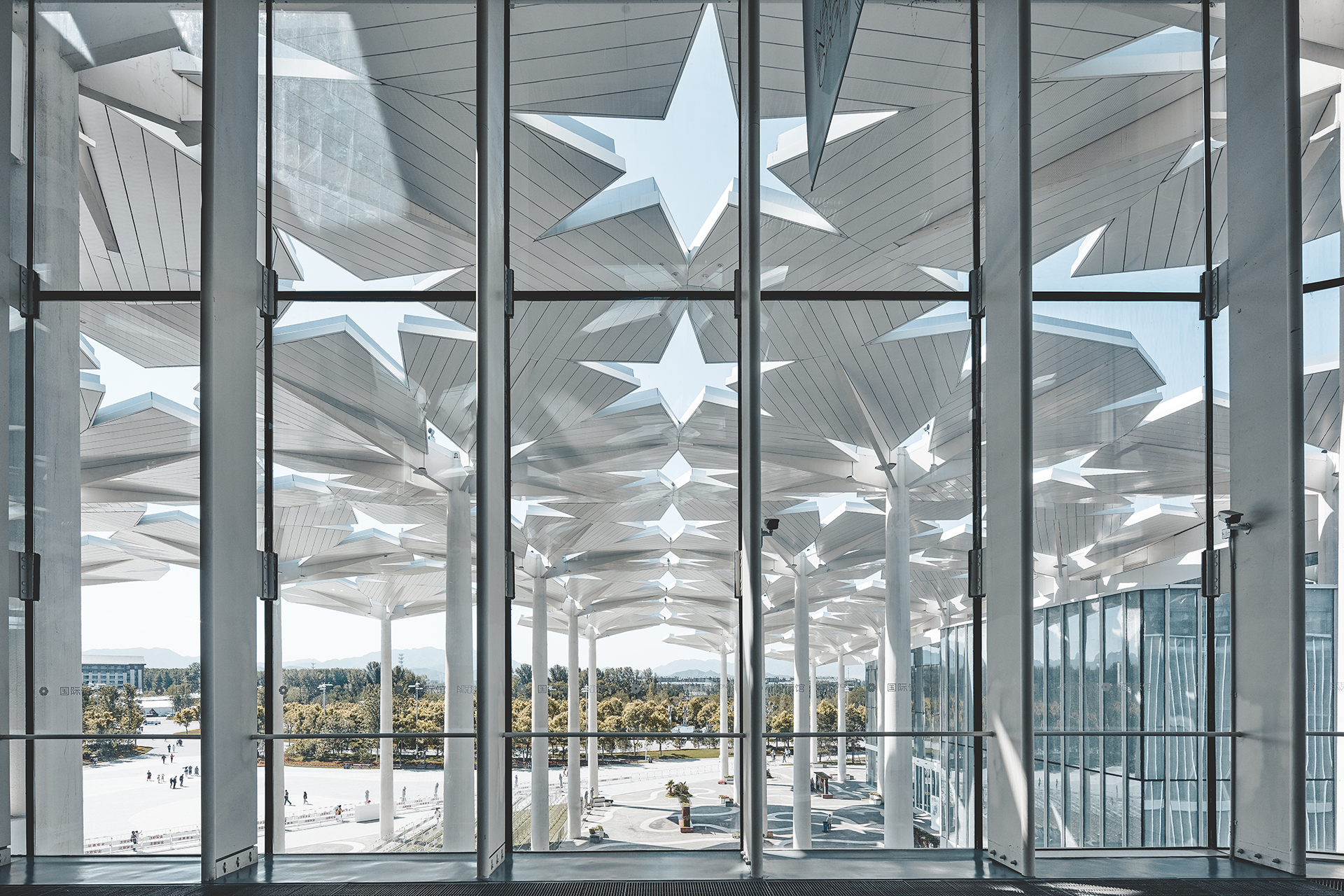 國際館屋面為輪廓為球面,94朵花傘有94種造型,設(shè)計通過縱向壓縮,將每4朵花傘統(tǒng)一為一個16.8X16.8矩陣網(wǎng)格,實現(xiàn)了對復(fù)雜造型的精確幾何控制。漏斗形花傘利于雨水排放和收集利用,花傘上方覆蓋光伏發(fā)電膜,體現(xiàn)綠色設(shè)計理念,花傘絢麗的夜景照明效果為2019北京世園會提供了最經(jīng)典的記憶。