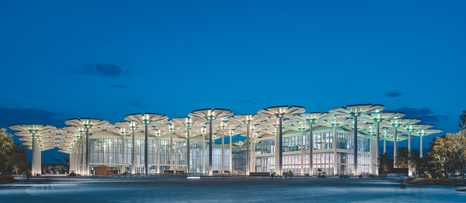 創(chuàng)新采用異型鋼框架結(jié)構(gòu)體系,實現(xiàn)建筑“花?!崩砟?。屋面94朵“花傘”組成的“花?!?,是本項目最矚目的造型特點。結(jié)構(gòu)設(shè)計充分利用建筑“花傘”造型和找形“花瓣”的幾何邏輯,“編織”既符合建筑外觀造型又滿足結(jié)構(gòu)受力需要的異形鋼框架。通過對異形鋼框架單元和整體結(jié)構(gòu)的深入分析,證明結(jié)構(gòu)具有較好的受力特性:屋蓋平面內(nèi)剛度較大,可協(xié)調(diào)南北展廳變形和受力,結(jié)構(gòu)抗側(cè)剛度和整體性較強;折形屋蓋通過豎向變形釋放溫度內(nèi)力,實現(xiàn)超長結(jié)構(gòu)不設(shè)縫。