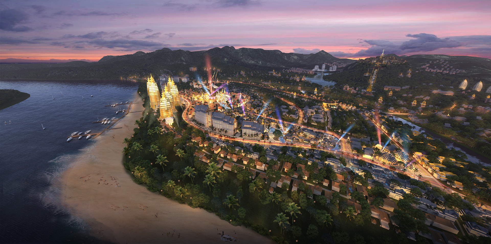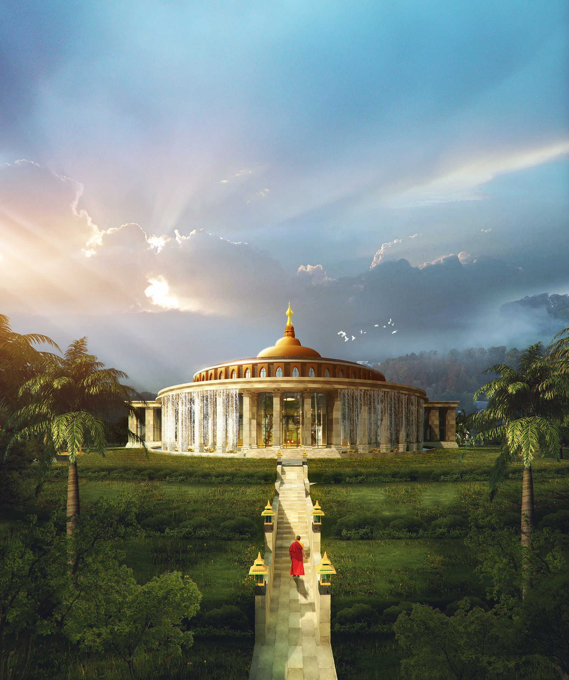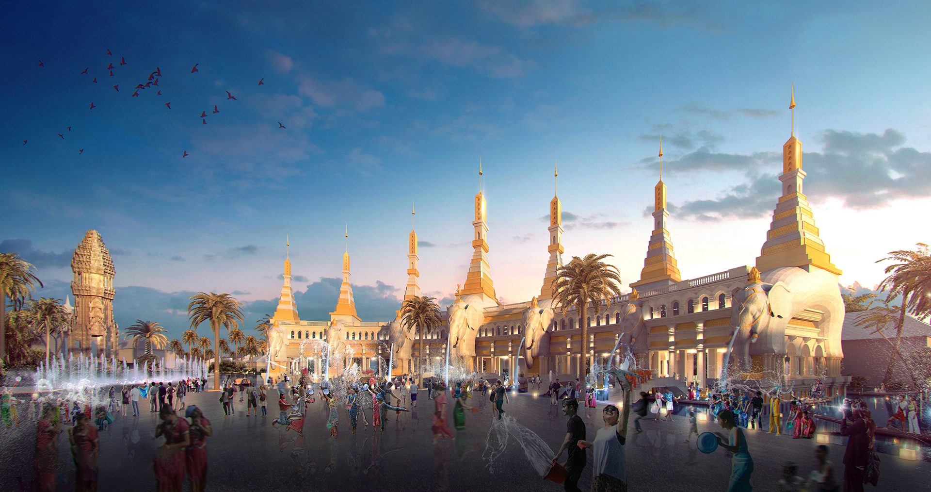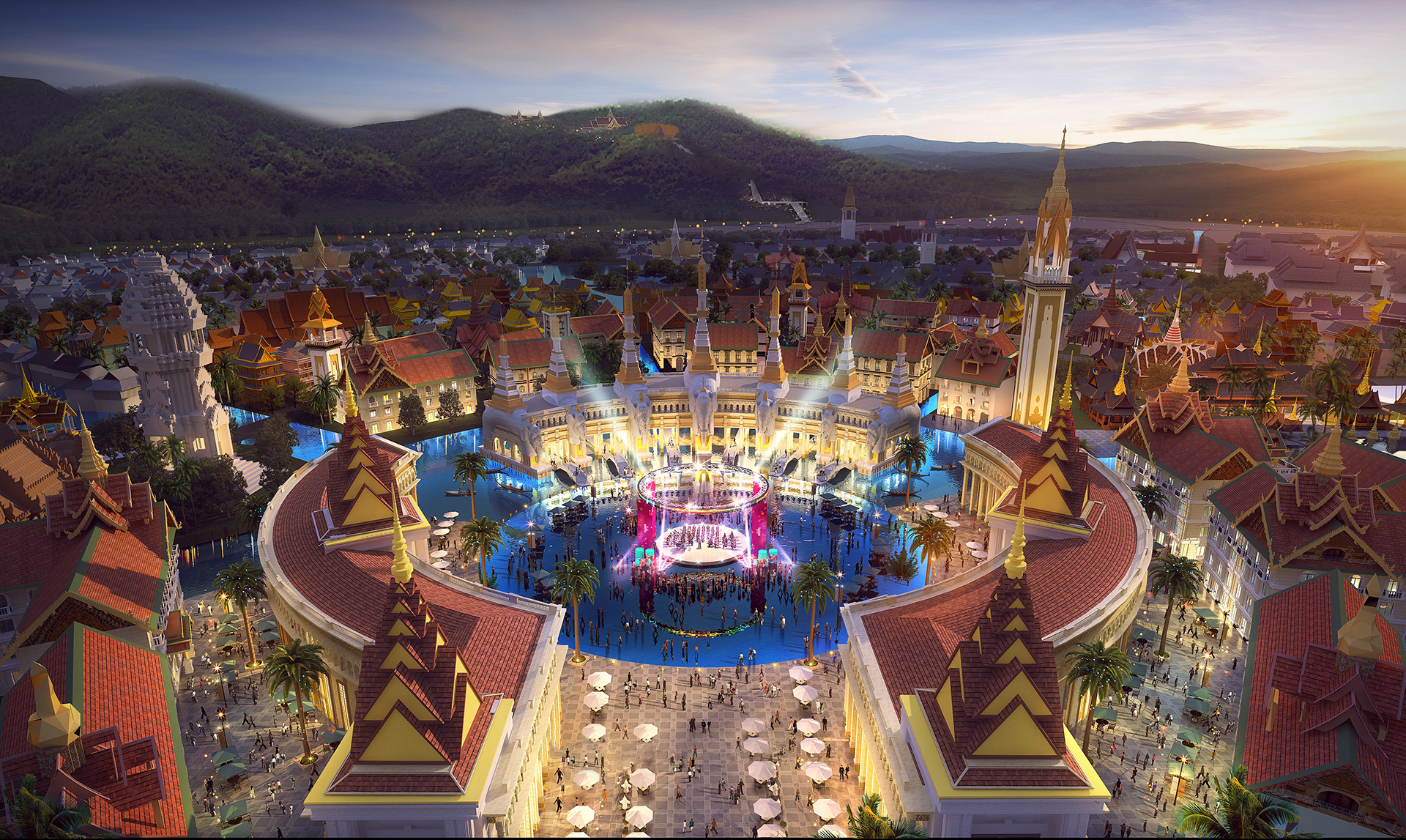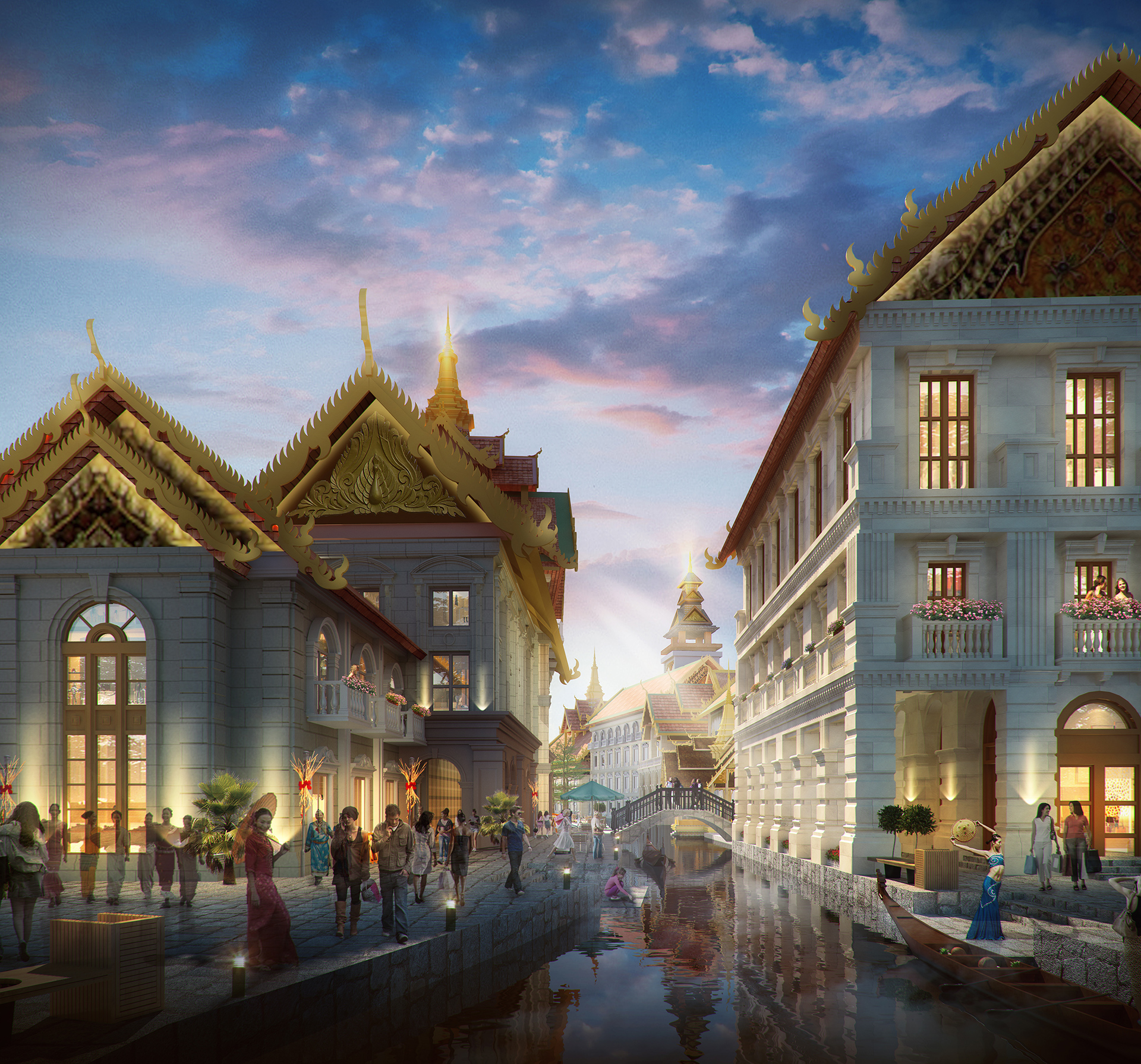 在建筑風(fēng)貌上,本項目緊扣傣泰文明主題,對六國傳統(tǒng)與現(xiàn)代、民俗與宗教建筑風(fēng)貌進行深入研究,并將其分類運用在適當(dāng)?shù)慕ㄖ愋椭?,形成以水連接,多元融合的彩虹國度景象。添加請在此處填寫