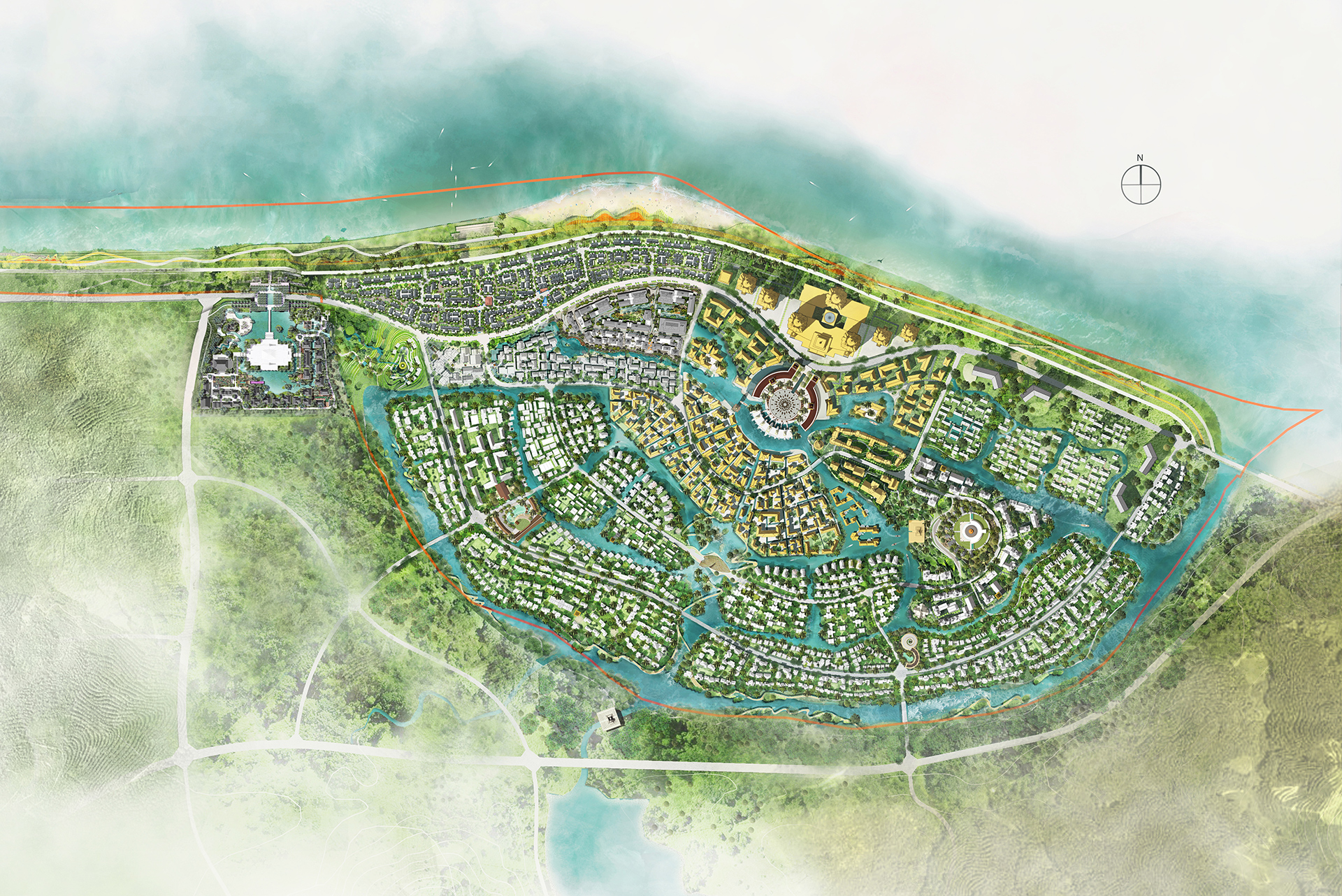 本項目位于云南景洪市,緊鄰國際河流瀾滄江,是融創(chuàng)的文旅開發(fā)項目。項目用地北至瀾滄江,與傣族園景區(qū)和楠景新城項目隔江相望。東、西、南均被古河道包圍,形成扇形島狀用地。凈用地面積約104公頃,容積率1.0。項目站位國際化,利用景洪市對東南亞旅游板塊的南大門位置,打造江心島為“彩虹國度——以水相連、多元交融的傣泰文明之國”,旨在體現(xiàn)傣泰文明中中國的龍頭位置,同時體現(xiàn)水城風(fēng)情和國際化特色。項目要求既具有景區(qū)核心吸引力,又可控制成本滿足產(chǎn)品銷售。因此,規(guī)劃和建筑設(shè)計采取“社區(qū)+景區(qū)”方式,以重要特色節(jié)點串聯(lián)大片社區(qū),成本差異化控制,實現(xiàn)適用、經(jīng)濟、綠色、美觀的要求。