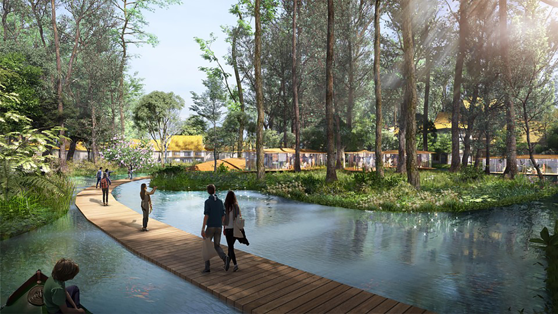 江心島以連續(xù)的水系串聯(lián)貝葉群島、瀾滄理想國和古河秘境三大功能主題片區(qū):貝葉群島片區(qū)呈現(xiàn)為六國水城,體現(xiàn)宗教、歷史盛世主題,建筑功能為餐飲零售、民宿集市。瀾滄理想國片區(qū)呈現(xiàn)高端現(xiàn)代的濱江建筑,體現(xiàn)文藝、年輕發(fā)展主題,建筑功能為文化演藝、商務(wù)酒店和高端公寓。古河密境片區(qū)則呈現(xiàn)東南亞悠然寧靜的棲居場景,體現(xiàn)生態(tài)、禪修主題,建筑功能為為鄰里中心和精品商墅。