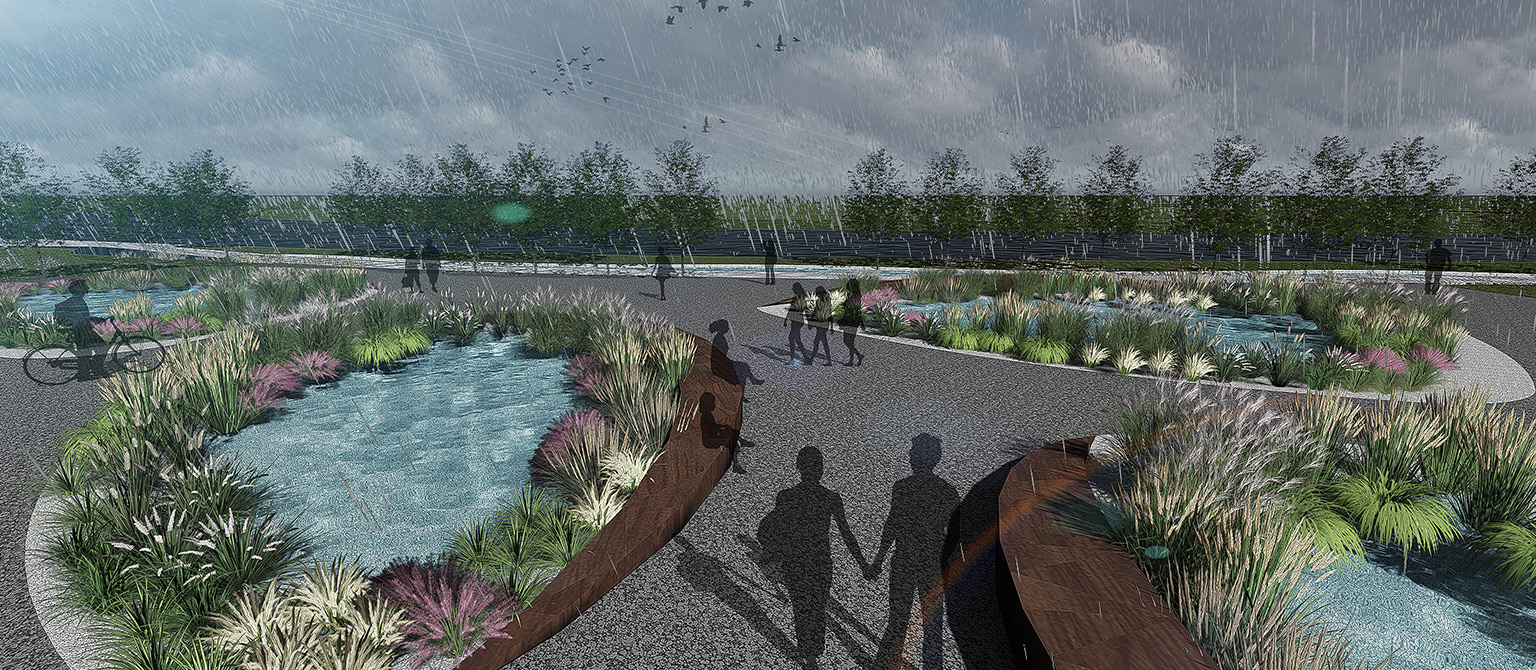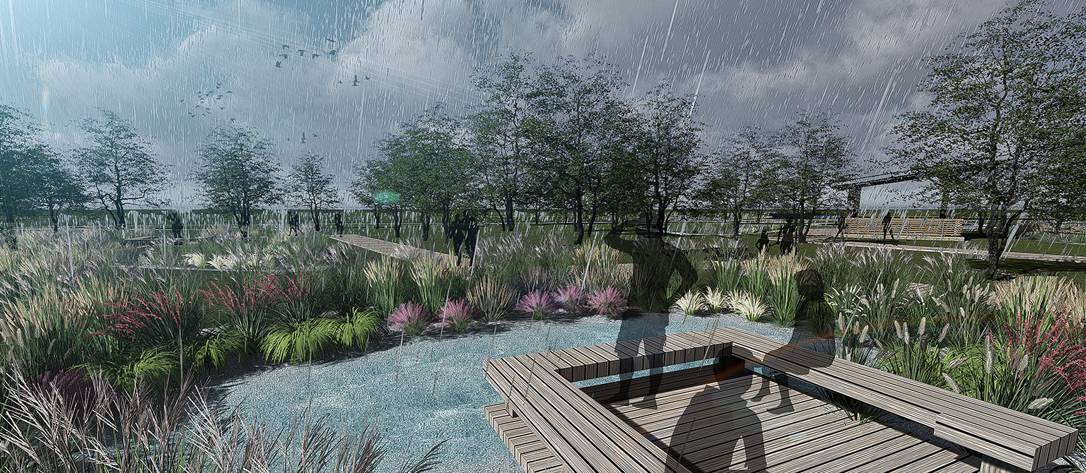 采用何種設(shè)計(jì)思路能凸顯景觀和生態(tài)的最大化?——嘉興素有“絲綢之府”的美譽(yù),設(shè)計(jì)通過一條如絲綢般的旱溪貫穿始終,塑造場地設(shè)計(jì)的完整性。旱溪一方面承擔(dān)了雨水收集、過濾、下滲重要的生態(tài)作用,另一方面承載了文化的象征意義。