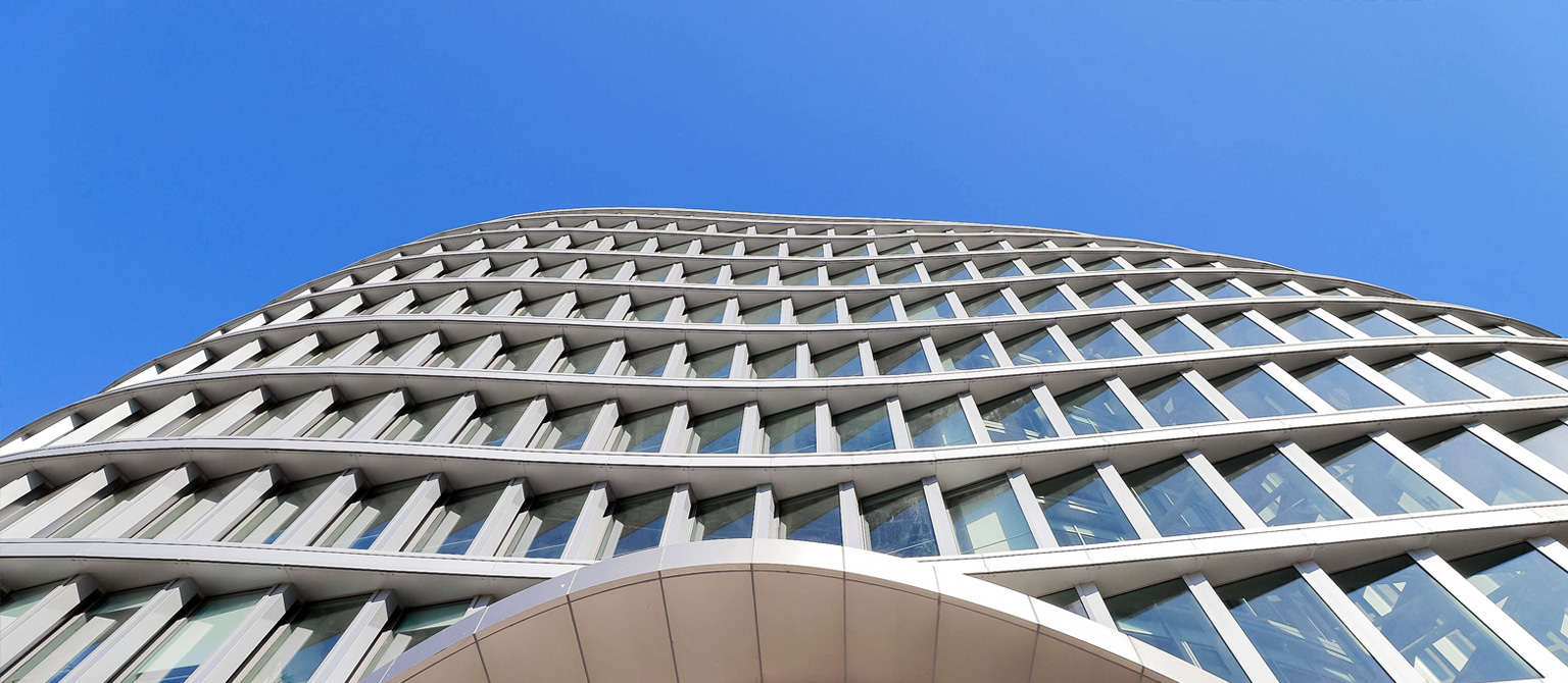本項目建筑形體的不規(guī)則帶來大量的復雜曲線和曲面,因而前期建立了幾何邏輯來控制。建筑軸網由放射軸和平行軸網的組合,前者控制幕墻及外圈幕墻柱實現(xiàn)形式一致,后者控制核心筒及建筑功能平面滿足承重和功能訴求,各自明晰互不干擾又合理關聯(lián)。各層板邊線和幕墻線都被擬合成為弧線的組合,曲面被逆合成傾斜的鋸齒幕墻,出入口曲面被擬合成單曲面,最終規(guī)避了所有的雙曲面,不僅效果豐富而且降低造價。