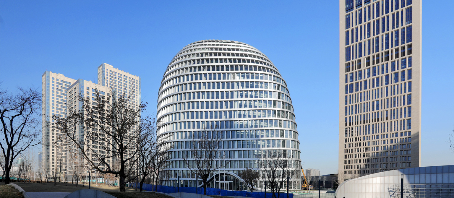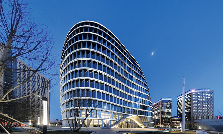 本園區(qū)未來將服務于2022年冬奧會,因此為了強調地域文化,方案取自于花樣滑冰的運動軌跡,通過層層流動的軌跡生成動感的建筑形象與中央綠地自由曲線融為一體,仿佛明珠一般鑲嵌在場地之中。城奧大廈作為本土原創(chuàng)設計的非標準大型復雜性公共建筑,由建筑師借助數(shù)字技術進行設計及建造控制。從設計到建造的整個過程充分體現(xiàn)了信息時代“個性化定制”實現(xiàn)自由設計的發(fā)展趨勢。
