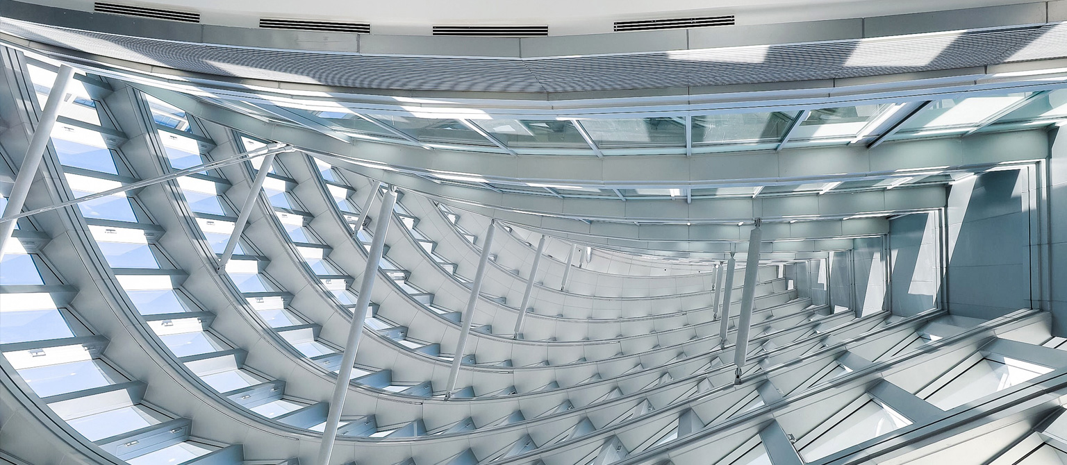 由于位于環(huán)形軸線上的地下柱子已經建成,為了實現(xiàn)與放射軸線控制的地上外幕墻柱的連接,在首二層采用V柱進行轉換,將地下結構通過極具表現(xiàn)力的手法轉換到樓上結構,同時符合結構受力特性。屋頂Y柱作為外幕墻柱在穹頂?shù)难由欤瑫r也具備重要的視覺需求。為了降低截面尺寸,設計將其模擬樹形分叉,在頂部收攏到一個圓環(huán)。內穹頂結構也沿放射軸線向中心匯聚到核心筒,最終與外穹頂網架聯(lián)系在一起,形成了非常穩(wěn)定的雙層穹頂結構。