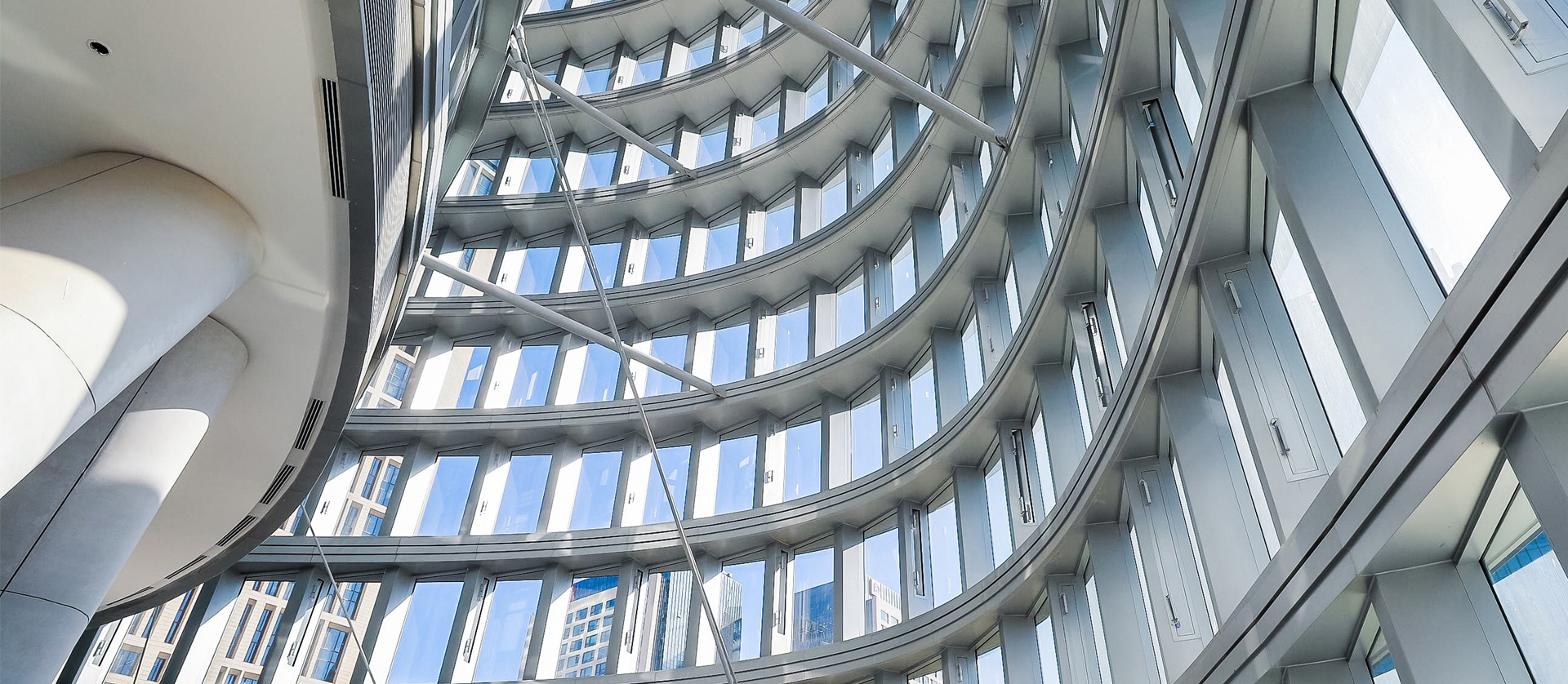 2.高60米的弧形邊庭空腔結構,立柱隨建筑幕墻位置隔根布置,上下不對齊,5層以上每兩層加水平支撐,以保證結構的穩(wěn)定。