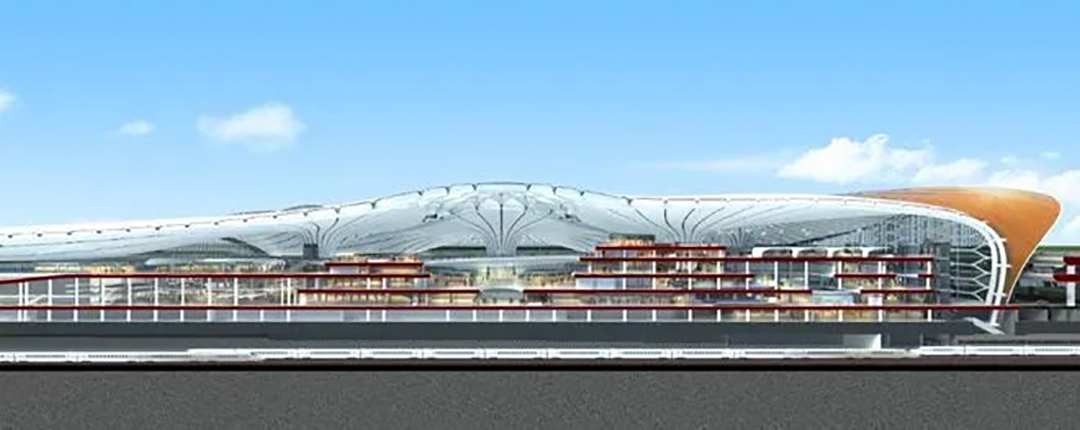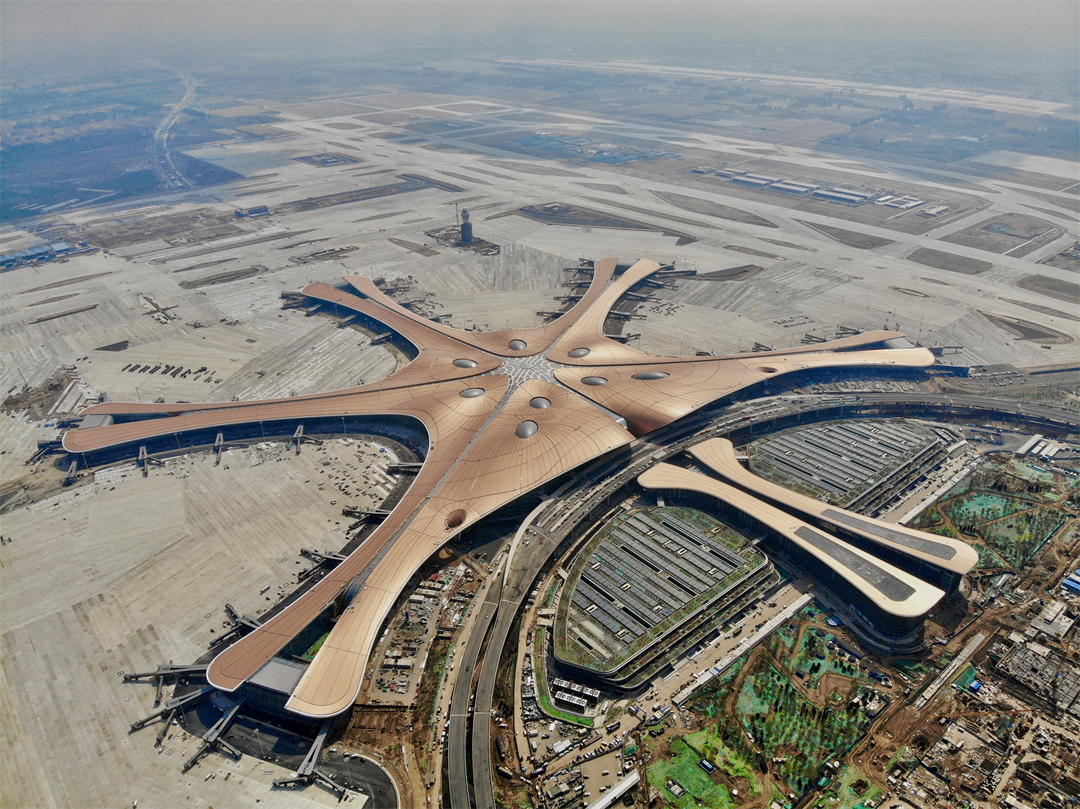 北京大興國(guó)際機(jī)場(chǎng)航站區(qū)總建筑面積約143萬(wàn)平方米,主要包括航站樓、綜合換乘中心、軌道站房、停車(chē)樓、綜合服務(wù)樓等主要的建筑單元,其中航站樓及交通換乘中心建筑面積約78萬(wàn)平米,屋蓋投影面積為35萬(wàn)平米,建筑頂標(biāo)高約為50米,屋蓋最大跨度為180米,最大懸挑為47米。航站樓南北長(zhǎng)996米,東西寬1144米,由中心區(qū)及中央南和東北、東南、西北、西南5個(gè)指廊組成。工程于2016年開(kāi)工,2019年6月底實(shí)現(xiàn)竣工驗(yàn)收,當(dāng)年9月25日正式投運(yùn)。