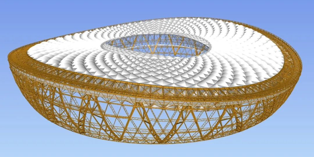 從功能性看,體育場環(huán)梁的頂點標(biāo)高和屋頂懸挑尺寸分別達到76.6米和95.9米,場內(nèi)固定座席數(shù)多達92500。體育場壯觀絢麗的建筑效果給人們帶來視覺上的享受,高標(biāo)準(zhǔn)的建筑功能則保障著世界杯閉幕式和包含決賽、半決賽在內(nèi)的10場比賽的順利舉辦。這也給結(jié)構(gòu)設(shè)計帶來巨大挑戰(zhàn)。