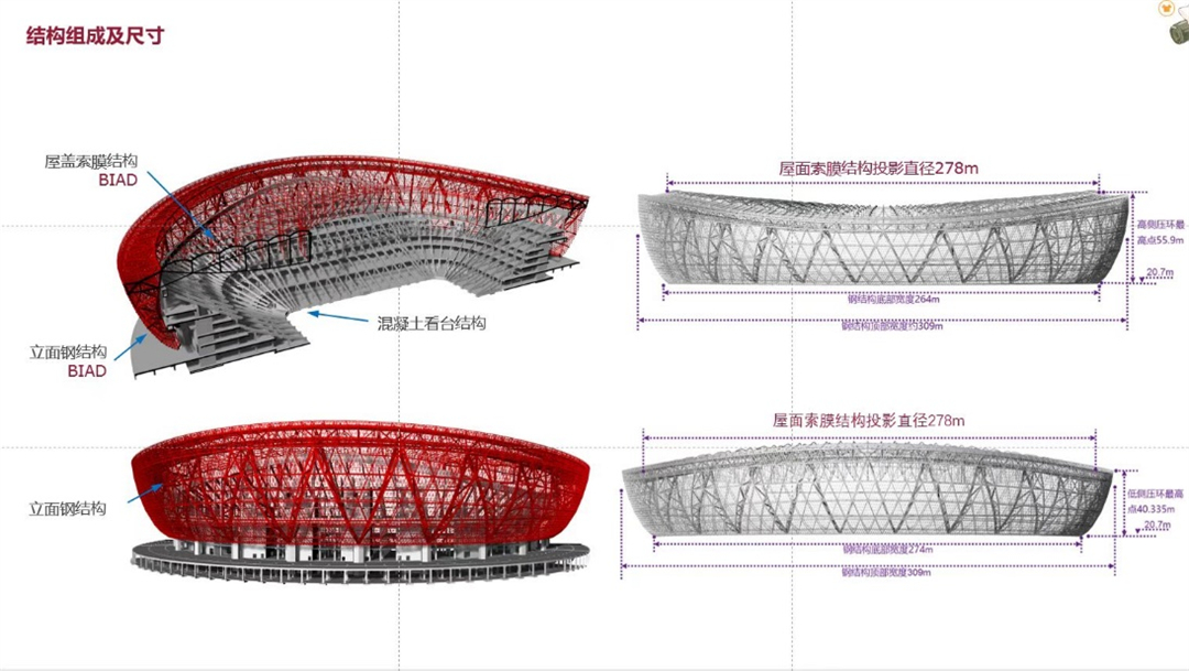 從外觀上看,這個跨度達278米的體育場的大跨度馬鞍形屋頂,采用了由主索桁架、次索系和膜結(jié)構(gòu)等組成的高效索膜結(jié)構(gòu)體系,并且尺度巨大,被我國空間結(jié)構(gòu)泰斗、中國工程院院士、浙江大學(xué)董石麟教授稱為“世界上最復(fù)雜的索膜結(jié)構(gòu)體系”。