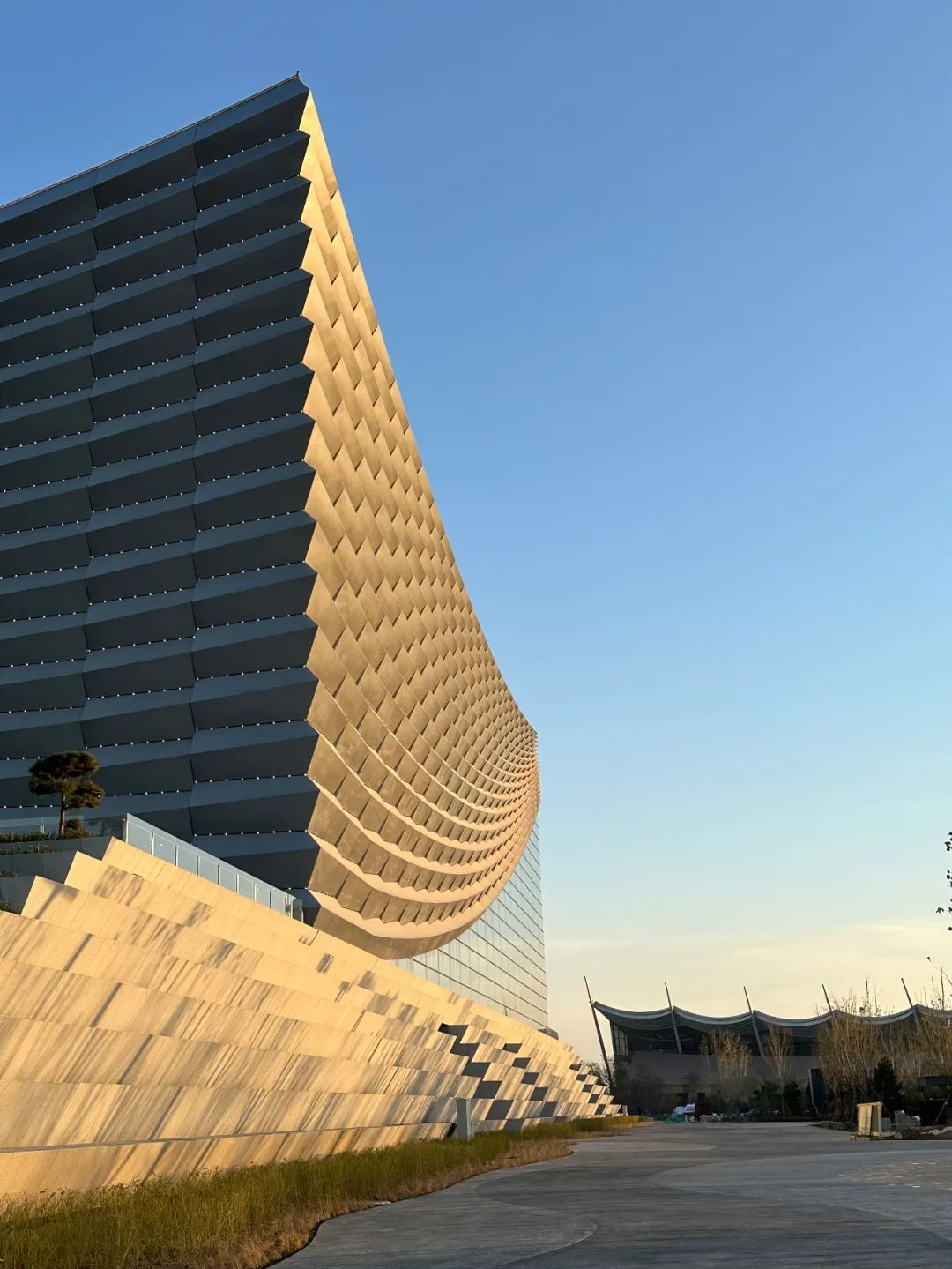 北京藝術(shù)中心最具視覺沖擊力的地方,就是外檐在陽光下呈現(xiàn)出美輪美奐的光影變化的“大幕拉開”的靈動(dòng)意象,其設(shè)計(jì)靈感來源于通州古糧倉和運(yùn)送物資的船舶,這些極具動(dòng)感的曲面造型和屋頂輪廓,既是對于古糧倉建筑屋面曲線的寫意勾勒,也抽象地再現(xiàn)了古運(yùn)河上運(yùn)輸船只揚(yáng)帆啟航的盛況。而“大幕拉開”的效果,是靠跨度超過155米的單層曲面鋼網(wǎng)殼的完美落架和4134塊不同的三角形幕墻單元嚴(yán)絲合縫拼接實(shí)現(xiàn)的。