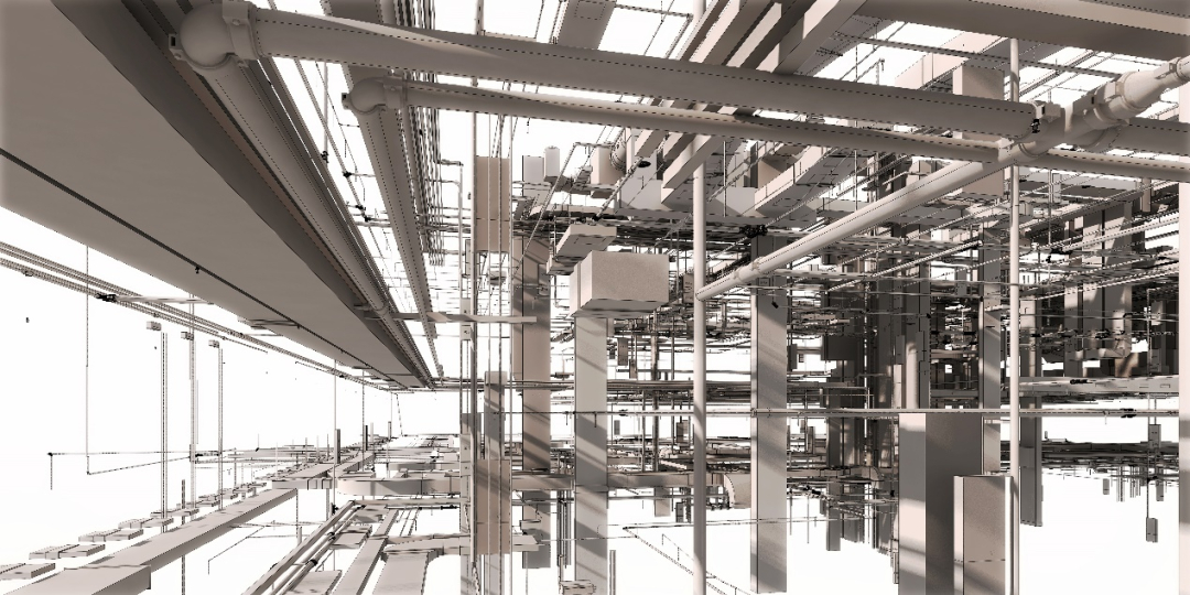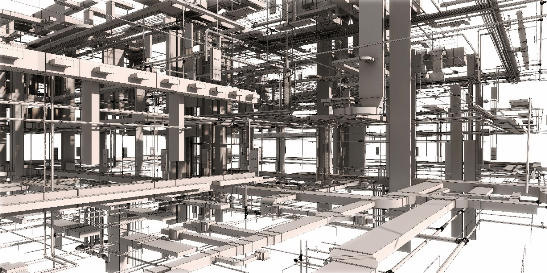此外,在專項(xiàng)設(shè)計(jì)方面以Rhino模型為基礎(chǔ),利用STEPS軟件,模擬人流疏散,輔助特殊消防設(shè)計(jì)。利用Rhino模型模擬觀眾視線,輔助劇場剖面設(shè)計(jì)。在管綜設(shè)計(jì)方面,設(shè)計(jì)團(tuán)隊(duì)利用Revit軟件將建筑、結(jié)構(gòu)、機(jī)電各專業(yè)模型信息集中反映在設(shè)計(jì)文件中,著重推敲控制各重點(diǎn)機(jī)房、重要空間、夾層空間等位置的管線排布,達(dá)到建筑要求的效果,以期確保施工完成后的凈高滿足設(shè)計(jì)要求。在機(jī)房設(shè)計(jì)中,進(jìn)行1:1排布,盡量減小機(jī)房空間,將更多空間留給主要功能。