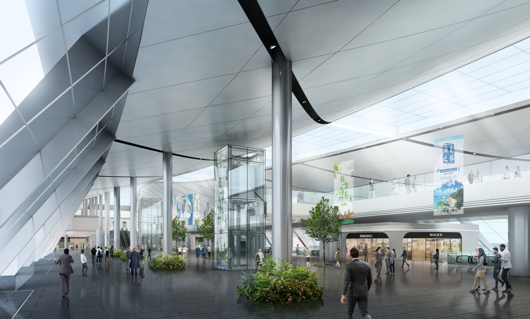整體式的建筑處理,將主樓、侯船廊、地面交通中心(GTC)覆蓋在一個連續(xù)的屋面之下。屋面的高低起伏,為下部各個功能區(qū)域提供了適宜的空間高度。流動的造型如浪潮澎湃、蛟龍出海,形成宏大的建筑氣勢。建筑首層僅保留必要的交通及辦公空間,其余部分皆為架空層,保證5.5米以上的凈空,最大限度的將場地利用起來,保證車行流線暢通無阻。