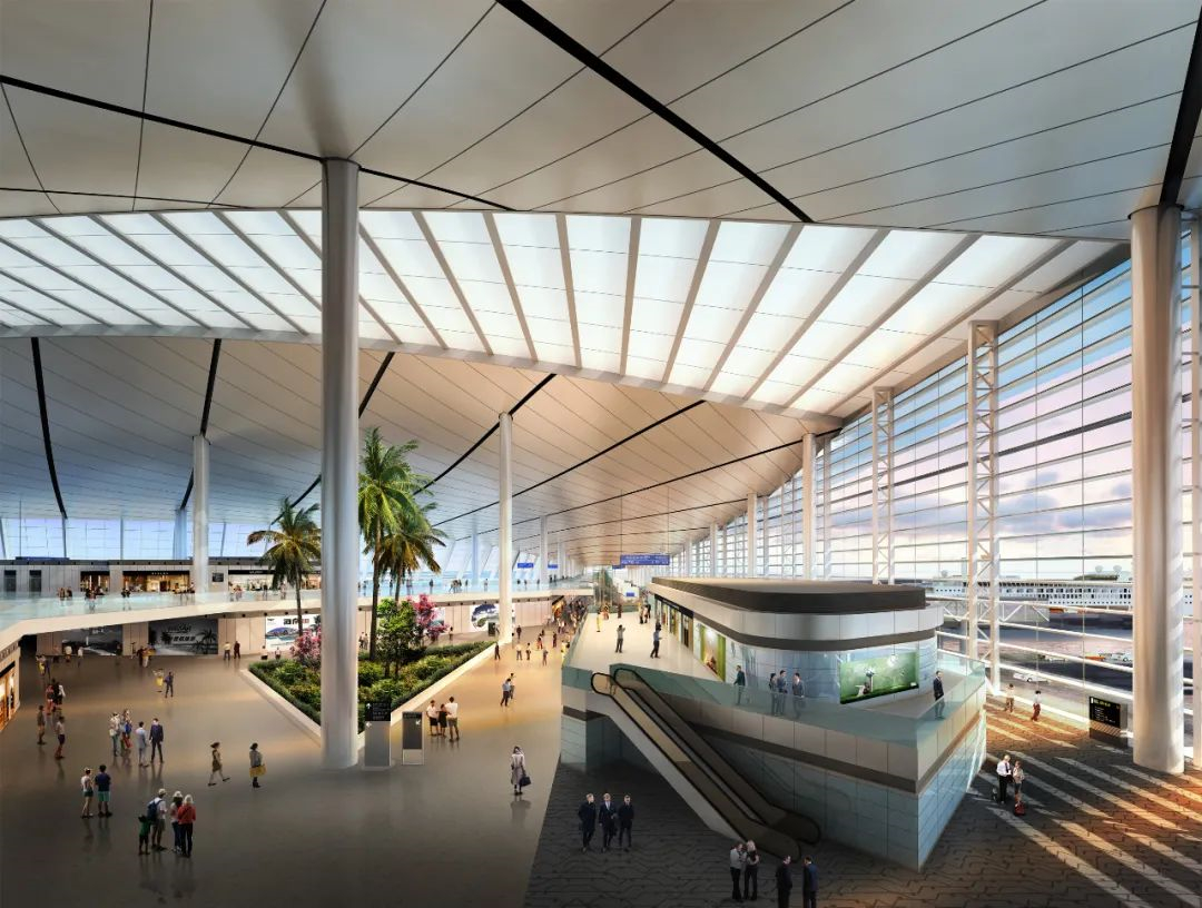新航站樓連接大海和城市,是??谑械男潞I祥T戶。構(gòu)型意向取自舒展修長的鰩魚,以曲線勾勒的形體為基礎(chǔ),富有動感,充滿活力。屋頂中脊和檐口兩條曲線在陸側(cè)延展,建筑底部架空,供進車輛通行-查驗-等候使用。陣列的支撐構(gòu)件如造船的龍骨搭建起主體建筑結(jié)構(gòu)。屋面具有600米長的沿海展開面,對海上乘船旅客展示出張開雙臂迎候的形勢,成為開口放眼世界的新大門。