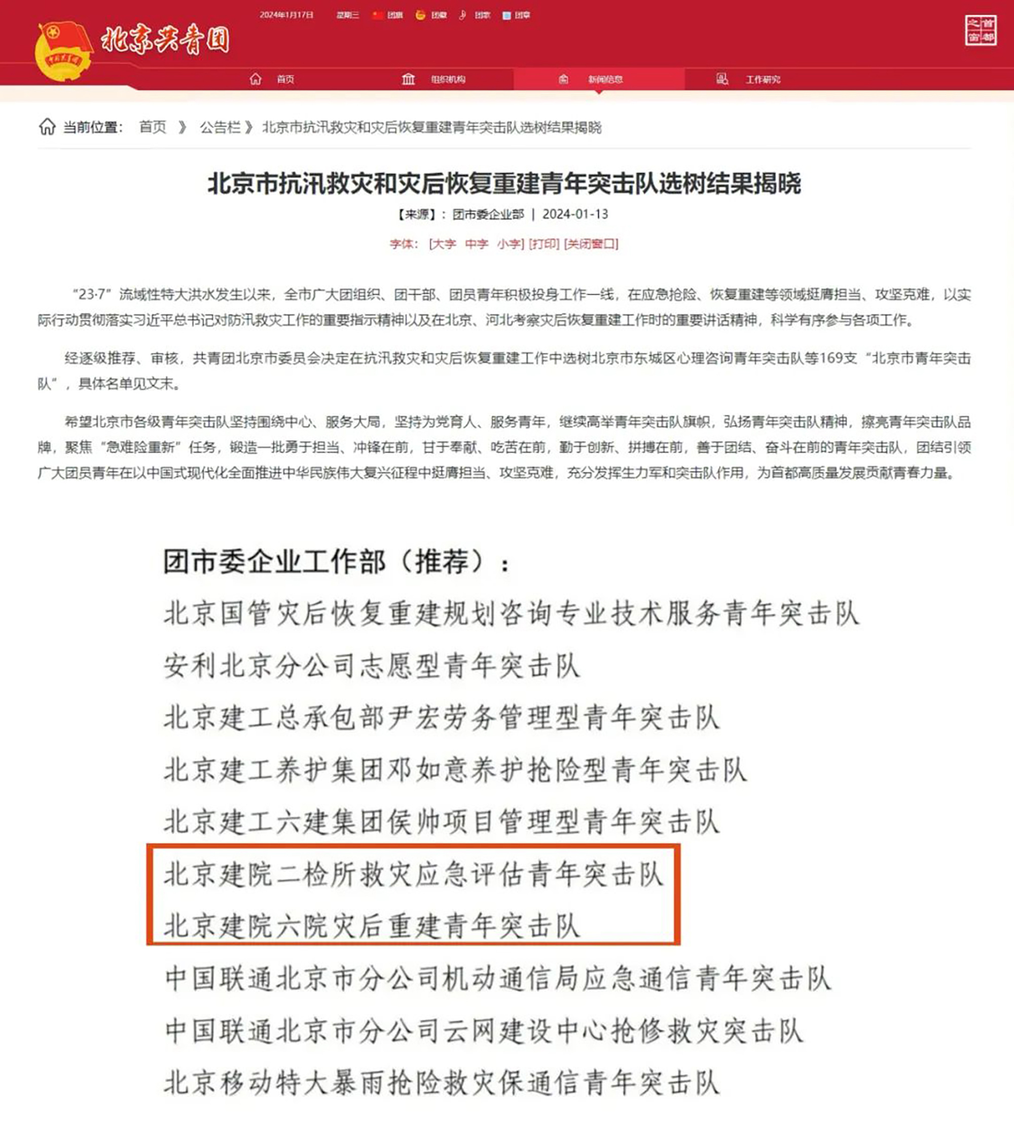 恰逢首支共青團(tuán)青年突擊隊(duì)成立70周年之際,經(jīng)逐級推薦、審核,決定,北京建院二檢所救災(zāi)應(yīng)急評估青年突擊隊(duì)、北京建院六院災(zāi)后重建青年突擊隊(duì)成功入選共青團(tuán)北京市委員會在抗汛救災(zāi)和災(zāi)后恢復(fù)重建工作中選樹的“北京市青年突擊隊(duì)”