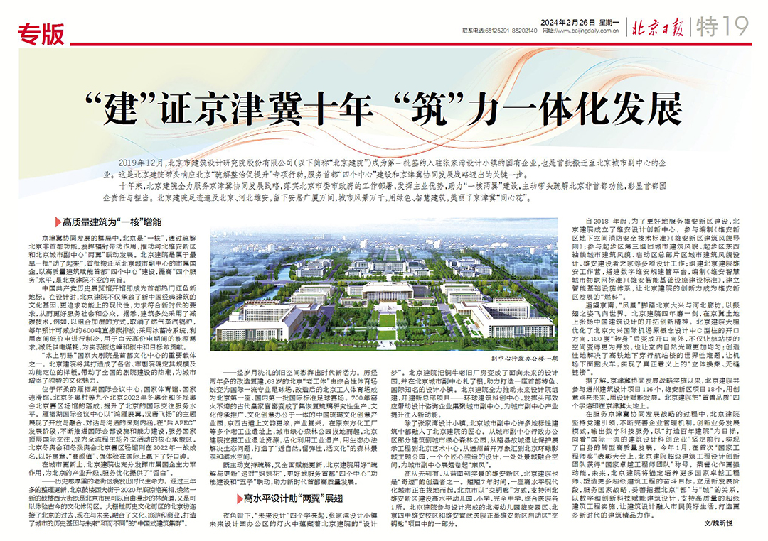 在服務(wù)京津冀協(xié)同發(fā)展戰(zhàn)略的過程中,北京建院堅持黨建引領(lǐng),不斷完善企業(yè)管理機(jī)制,創(chuàng)新業(yè)務(wù)發(fā)展模式,輸出數(shù)字科技服務(wù),以“打造百年建院”為目標(biāo),向著“國際一流的建筑設(shè)計科創(chuàng)企業(yè)”堅定前行,實現(xiàn)了自身的轉(zhuǎn)型高質(zhì)量發(fā)展。今年1月,在首次“國家工程師獎”表彰大會上,北京建院超級建筑工程設(shè)計創(chuàng)新團(tuán)隊獲得“國家卓越工程師團(tuán)隊”稱號。榮譽(yù)化作更強(qiáng)動能,未來,北京建院將錨定培養(yǎng)更多國家卓越工程師、塑造更多超級建筑工程的奮斗目標(biāo),立足新發(fā)展階段,服務(wù)國家戰(zhàn)略,妥善把握北京“都”與“城”的關(guān)系,以數(shù)字和創(chuàng)新科技賦能建筑設(shè)計,支持高質(zhì)量的超級建筑工程實施,讓建筑設(shè)計融入市民美好生活,打造更多新時代的建筑精品力作。