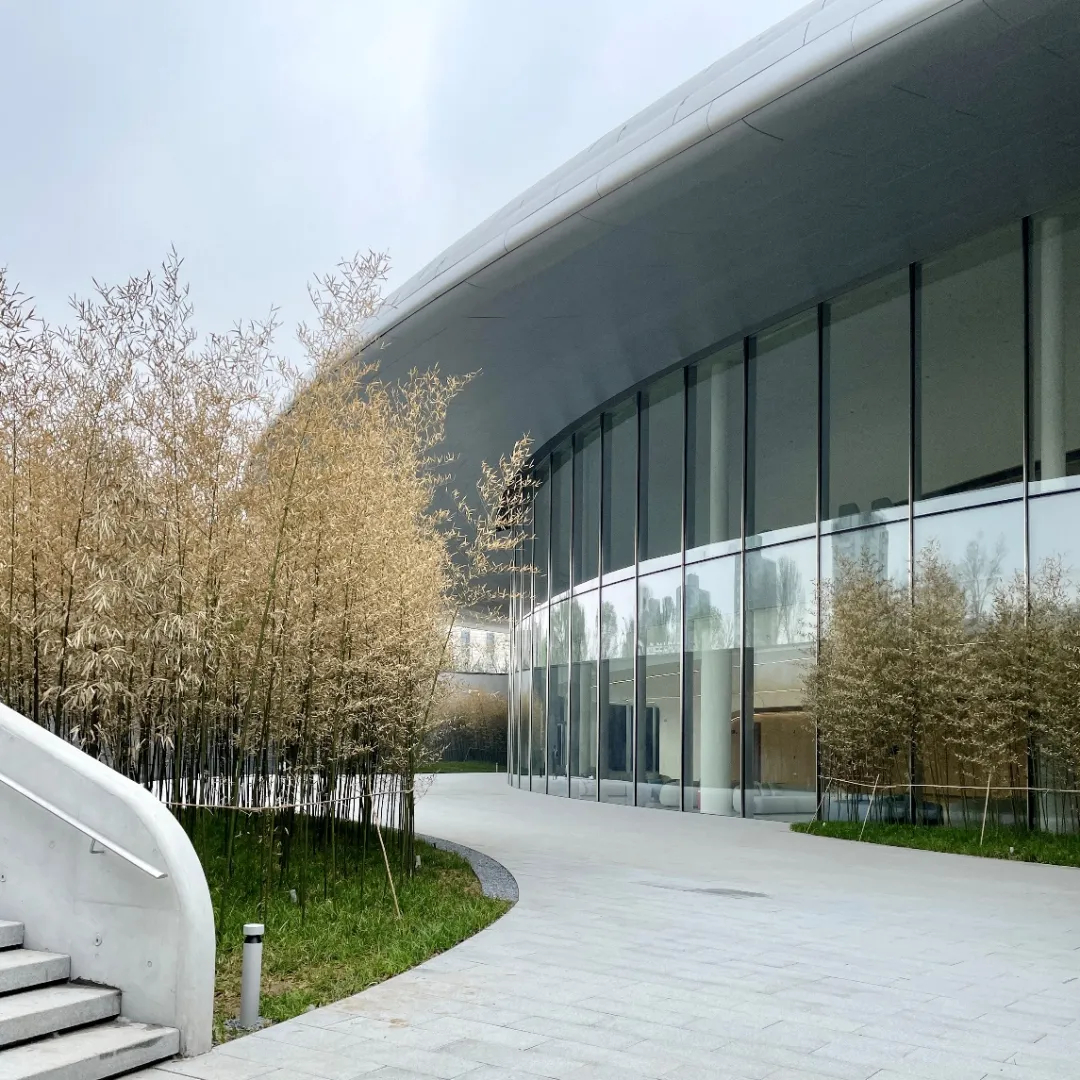 建筑造型充分考慮了“三山五園”地區(qū)自身的環(huán)境特點,用覆土建筑的方式大膽創(chuàng)造了無北立面的建筑,建筑伏于大地之上,由北向南緩緩舒展。遵從中國傳統(tǒng)建筑注重“天人合一”的思想,強調(diào)建筑與環(huán)境的有機融合,挑檐深遠而平緩。從不遠處的三山向會址方向遠眺,建筑體量消隱于城市中,綠色屋面以含蓄謙遜的姿態(tài)融入大環(huán)境中,也成為都市中難得的大地景觀。