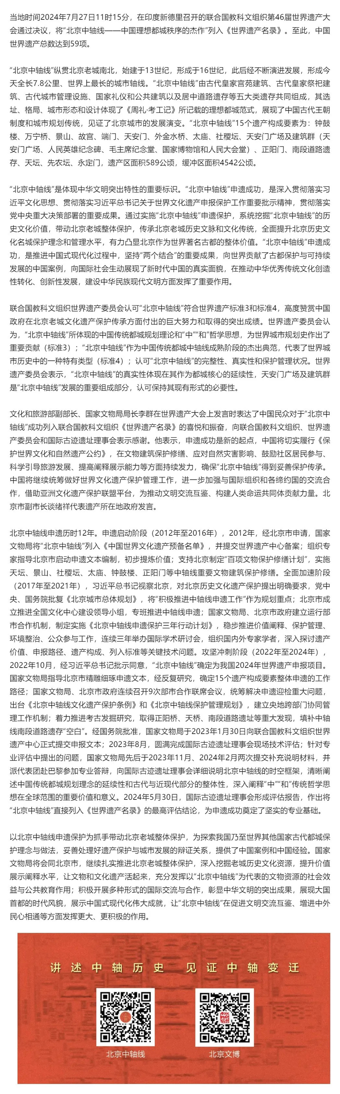 當(dāng)?shù)貢r(shí)間2024年7月27日,在印度新德里召開(kāi)的聯(lián)合國(guó)教科文組織第46屆世界遺產(chǎn)大會(huì)通過(guò)決議,將“北京中軸線(xiàn)——中國(guó)理想都城秩序的杰作”列入《世界遺產(chǎn)名錄》。