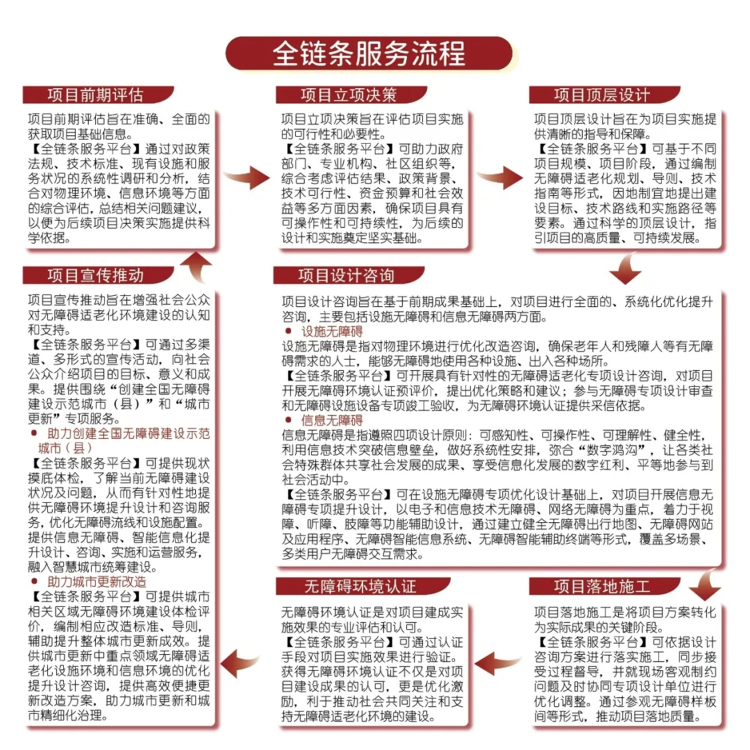全鏈條無障礙適老化服務(wù)平臺秉承“提倡平等和包容、服務(wù)于老齡人士、服務(wù)于殘障人士、倡導(dǎo)全鏈條體系、弘揚共享精神、落實《無障礙環(huán)境建設(shè)法》”的宗旨和原則,核心目的是通過組建我國無障礙適老化環(huán)境建設(shè)相關(guān)領(lǐng)域的專業(yè)團隊,面向全國范圍提供無障礙適老化的項目前期評估、立項決策、頂層設(shè)計、優(yōu)化提升、落地施工、無障礙環(huán)境認證、項目宣傳推動等服務(wù),將著力創(chuàng)建全國無障礙建設(shè)示范城市(縣),助力城市更新,構(gòu)建無障礙適老化產(chǎn)品庫,為老年人和殘障人士提供更好的生活環(huán)境。