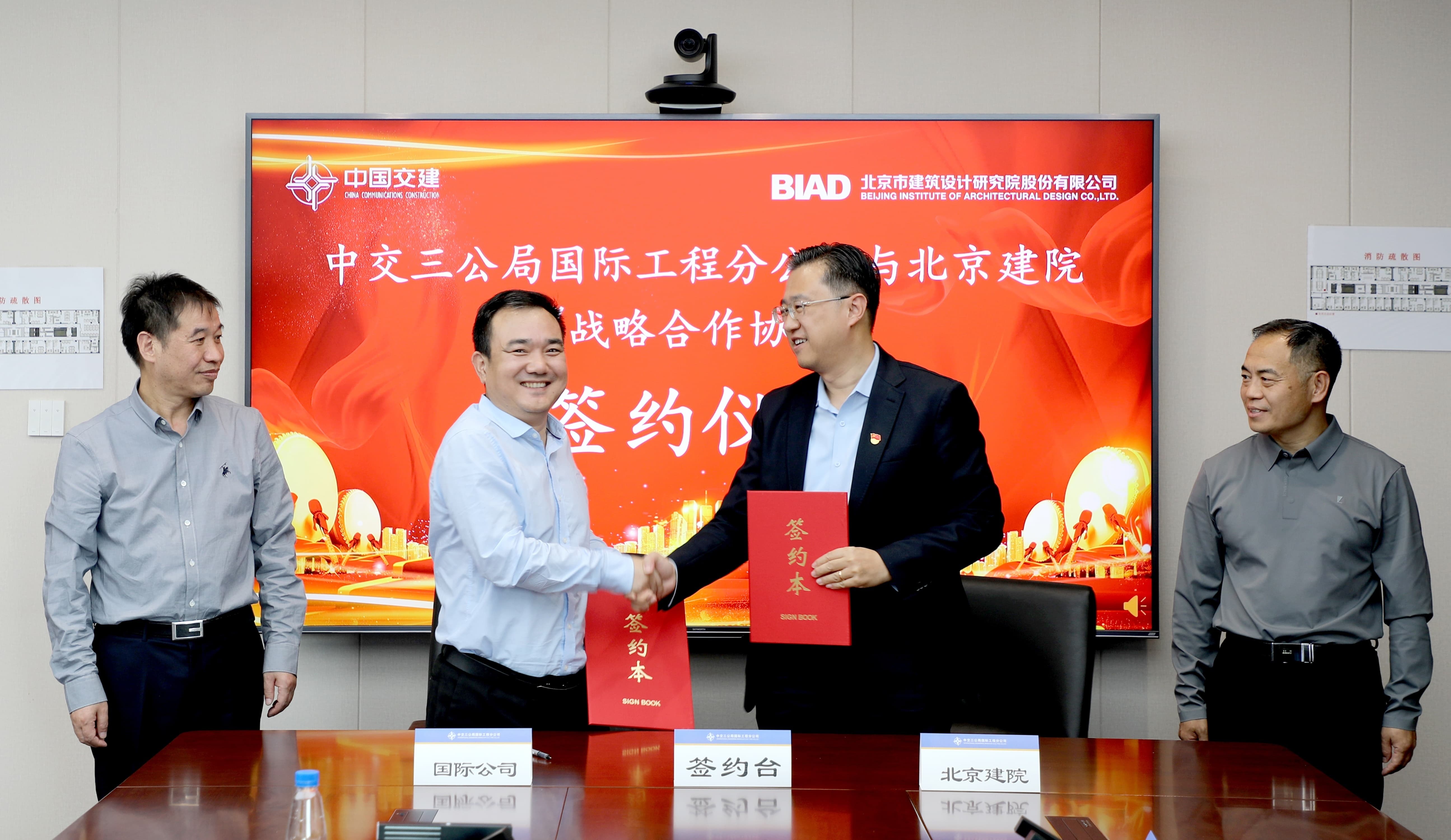 2024年10月15日,北京市建筑設(shè)計(jì)研究院股份有限公司與中交第三公路工程局有限公司國際工程分公司簽署戰(zhàn)略合作協(xié)議。北京建院副總經(jīng)理王樸軍,建筑與環(huán)藝設(shè)計(jì)院黨支部書記、院長李大鵬;中交三公局國際工程分公司黨委副書記、總經(jīng)理孫亞鵬,副總經(jīng)理王純海,總工程師高曉宇參加座談和簽約儀式。