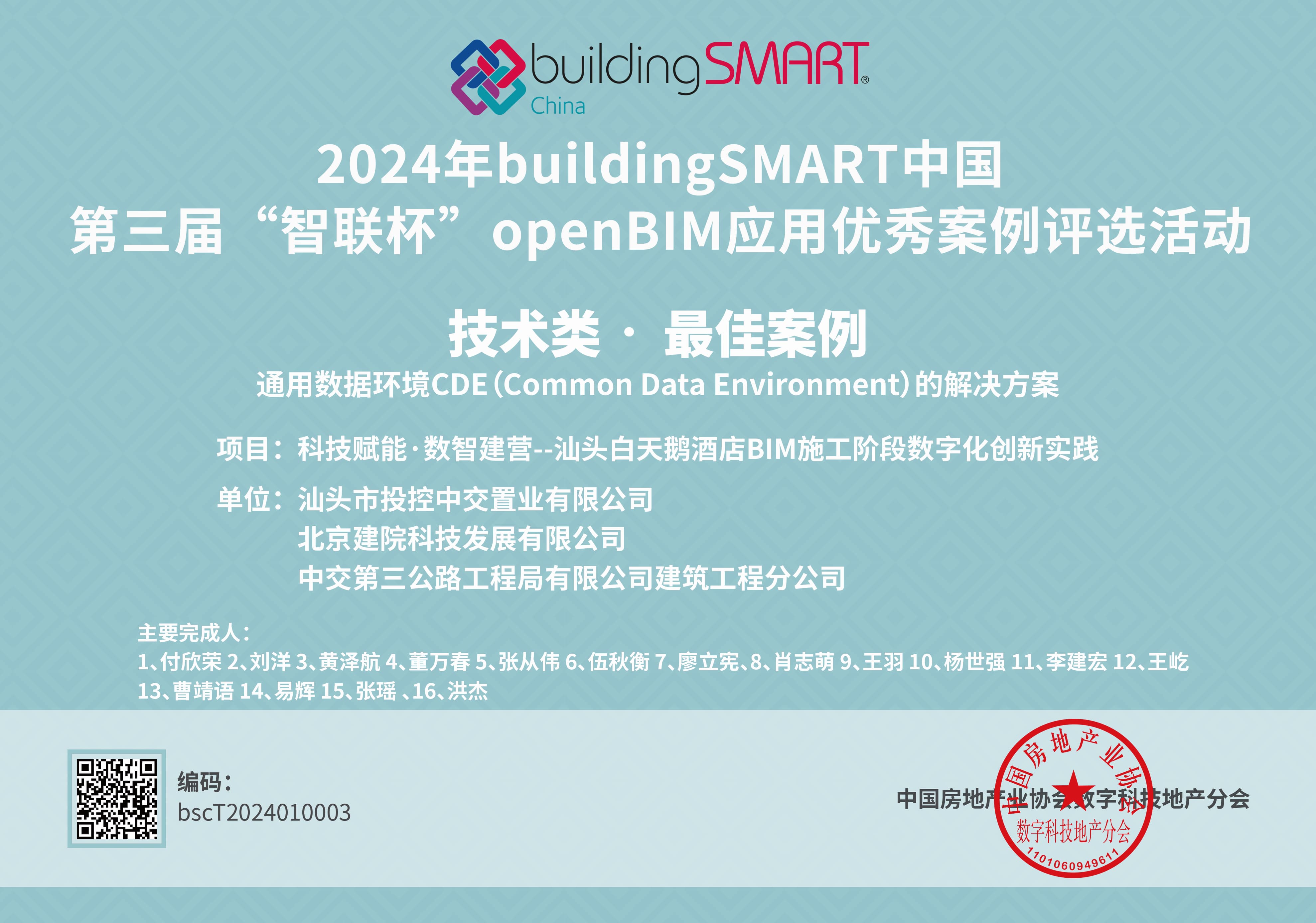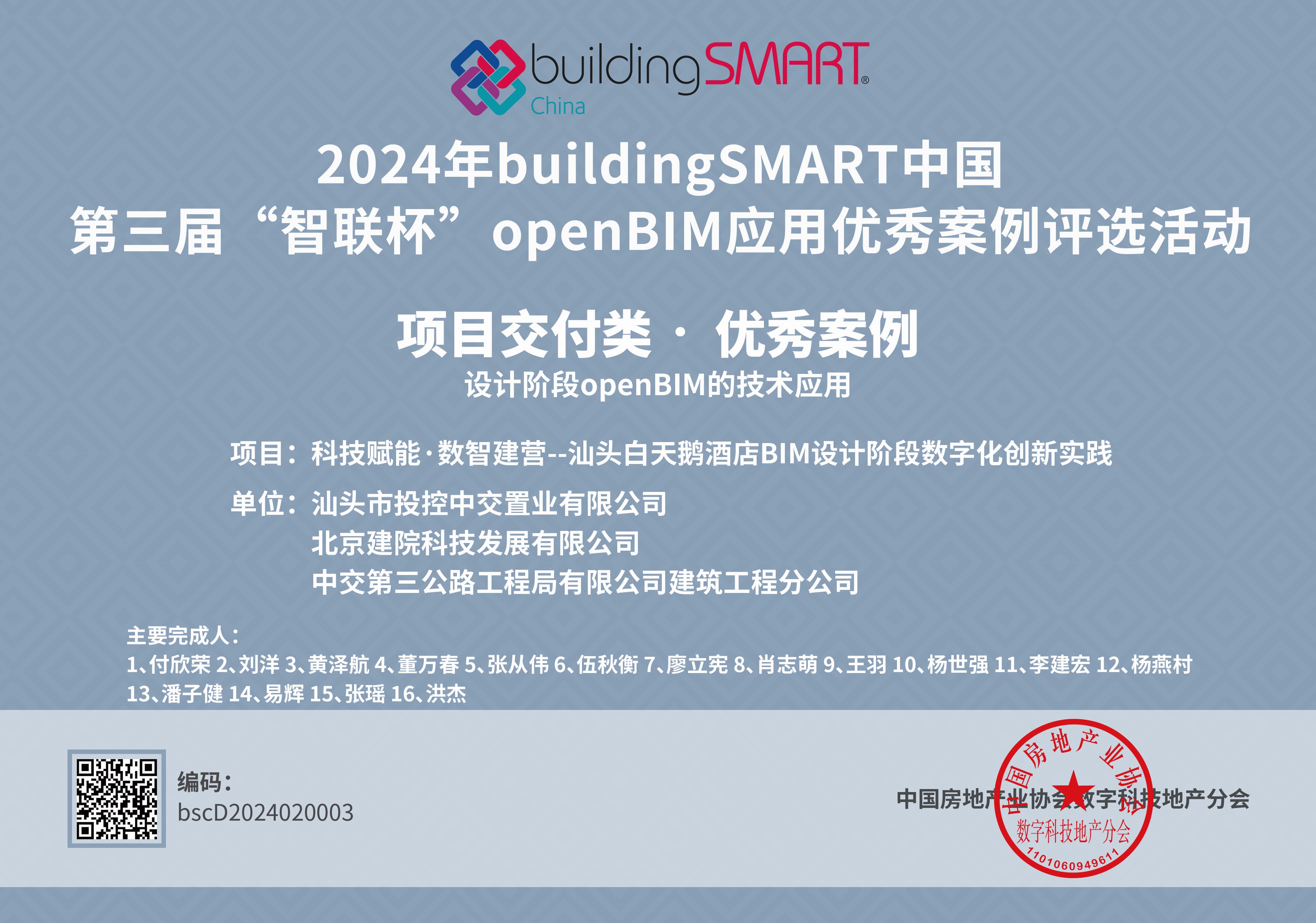 本屆“智聯(lián)杯”共18家企業(yè)在openBIM應(yīng)用優(yōu)秀案例評選活動中獲得獎項,其中北京建院科技發(fā)展公司的汕頭白天鵝酒店項目獲得設(shè)計階段openBIM項目交付類優(yōu)秀案例獎和施工階段的技術(shù)類最佳案例獎。