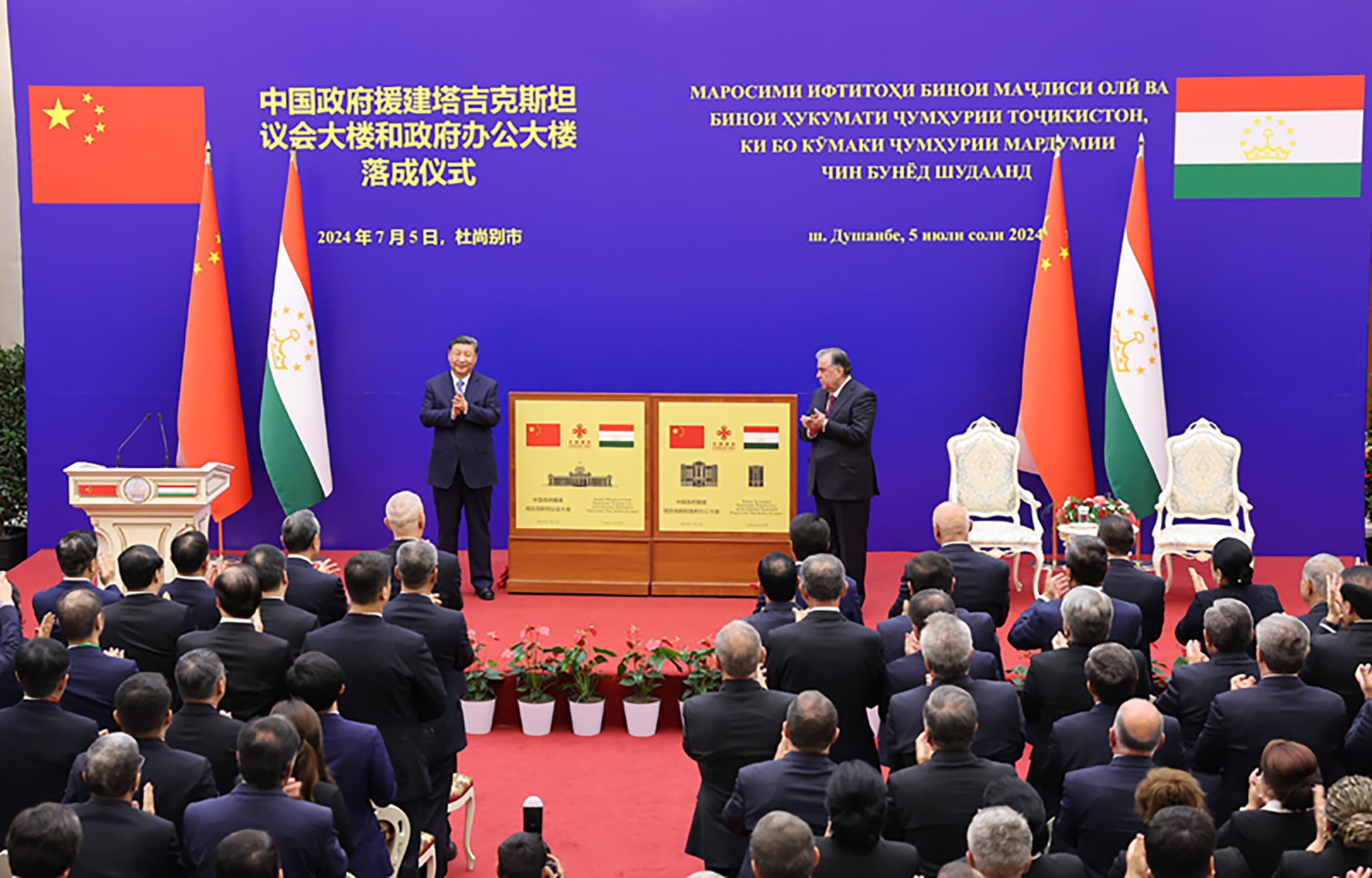 2024年7月5日下午,國(guó)家主席習(xí)近平同塔吉克斯坦總統(tǒng)拉赫蒙在杜尚別共同出席中方援塔議會(huì)大樓和政府大樓落成儀式。兩國(guó)元首共同參觀中方援塔議會(huì)大樓和政府大樓項(xiàng)目展板,共同為兩座大樓揭牌。