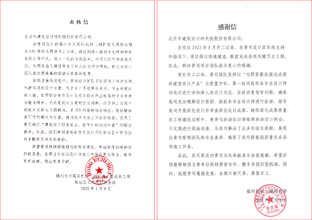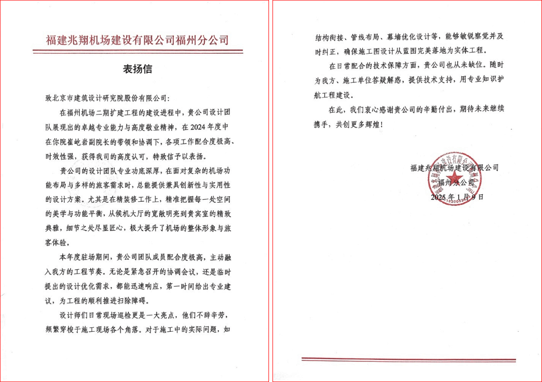 近日,北京市建筑設(shè)計(jì)研究院股份有限公司收到了福建兆翔機(jī)場(chǎng)建設(shè)有限公司福州分公司、福州長(zhǎng)樂(lè)國(guó)際機(jī)場(chǎng)二期擴(kuò)建工程機(jī)場(chǎng)工程航站區(qū)工程項(xiàng)目聯(lián)合體以及中建三局集團(tuán)有限公司福州長(zhǎng)樂(lè)國(guó)際機(jī)場(chǎng)二期項(xiàng)目部發(fā)來(lái)的感謝信,感謝北京建院在福州機(jī)場(chǎng)二期擴(kuò)建工程項(xiàng)目推進(jìn)中的鼎力支持,并對(duì)北京建院設(shè)計(jì)團(tuán)隊(duì)的卓越專業(yè)能力、高度敬業(yè)精神以及在項(xiàng)目推進(jìn)中展現(xiàn)的科學(xué)規(guī)劃、精誠(chéng)合作精神給予了肯定與贊譽(yù)。