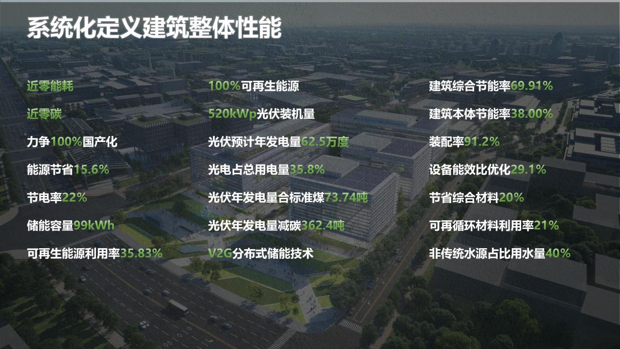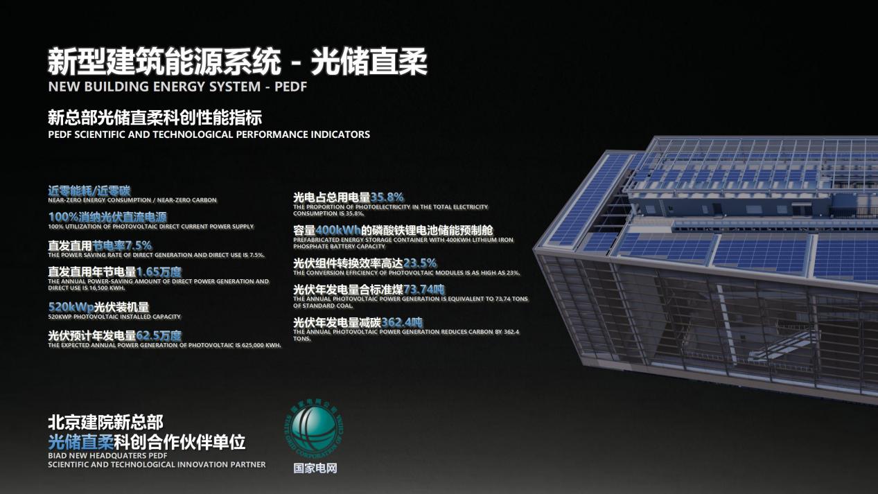 北京建院新總部項目位于北京城市副中心張家灣設計小鎮(zhèn),是北京城市副中心體量最大的近零能耗、近零碳“雙碳建筑”。作為一項集綠色、低碳、健康、智慧、可持續(xù)等前沿技術與理念于一體的示范性工程,北京建院新總部項目在設計和建設過程中全面貫徹綠色低碳發(fā)展理念,融合多項建筑節(jié)能與清潔能源技術,打造2035辦公原型建筑新范式。項目核心技術包括超低能耗外圍護結(jié)構、高效電機設備系統(tǒng)、建筑光伏一體化、光儲直柔系統(tǒng)、全彩光伏微圖層等,突出體現(xiàn)了“技術融合、系統(tǒng)集成、智慧管理”的先進特征。