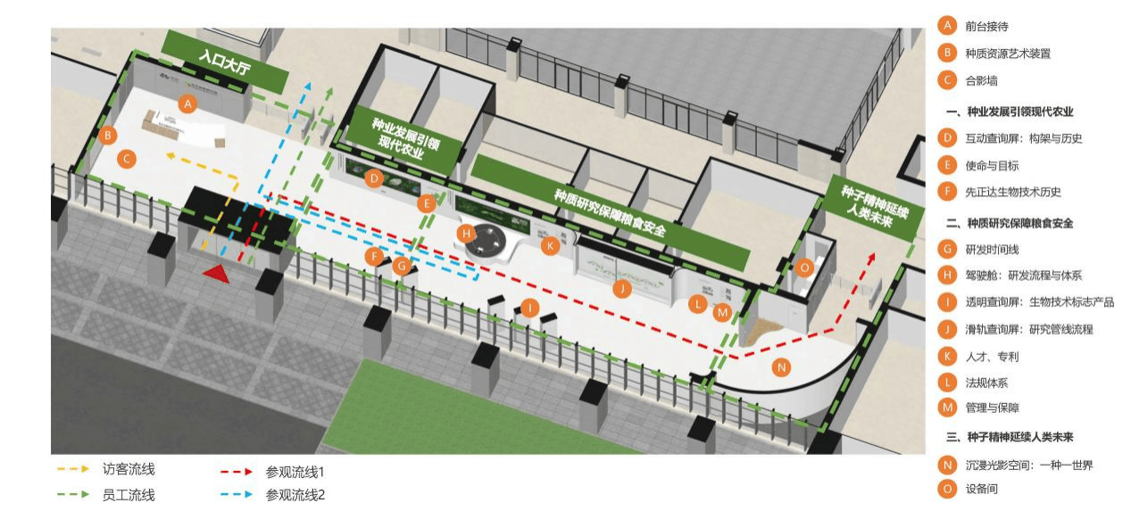 展廳以“種子精神”為核心,圍繞“種業(yè)發(fā)展引領(lǐng)現(xiàn)代農(nóng)業(yè)、種質(zhì)研究保障糧食安全、種子精神延續(xù)人類未來”三大板塊,構(gòu)建了層次分明的敘事邏輯。通過沉浸式光影空間、互動展項與實物模型相結(jié)合的形式,將農(nóng)業(yè)科技的專業(yè)性與人文情懷完美融合,既滿足政府、高校、企業(yè)等多元受眾的需求,又凸顯了先正達作為國家戰(zhàn)略科技力量的責(zé)任擔(dān)當(dāng)。