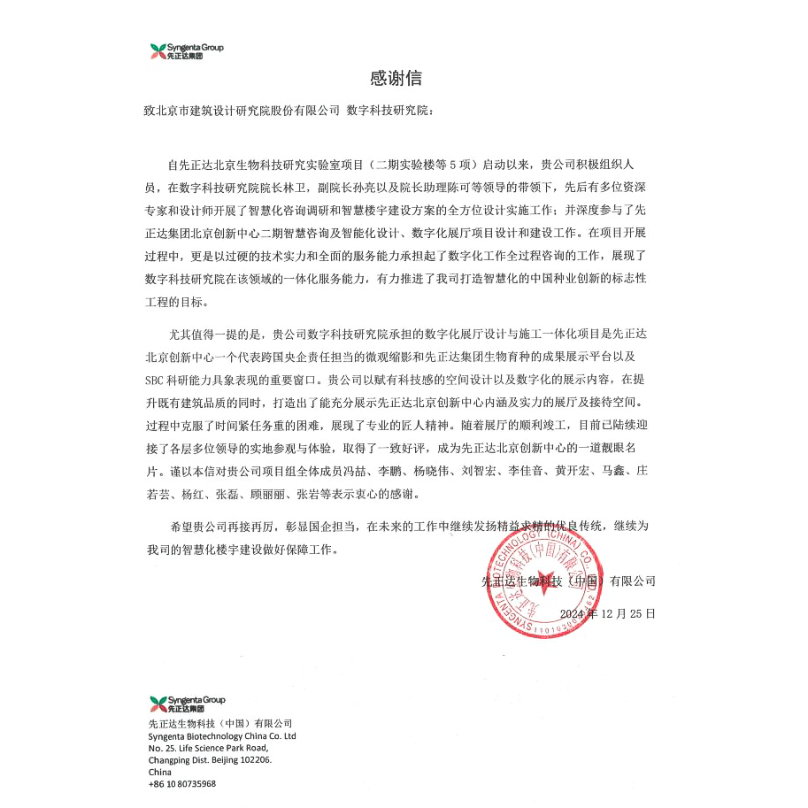 2024年12月25日,先正達生物科技(中國)有限公司向北京建院數(shù)字科技研究院發(fā)來感謝信,對其在先正達集團北京創(chuàng)新中心二期智慧咨詢及智能化設(shè)計、數(shù)字化展廳項目設(shè)計和建設(shè)工作中的出色表現(xiàn)給予贊揚和感謝。