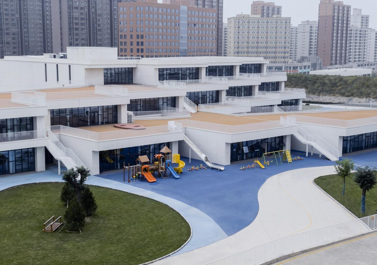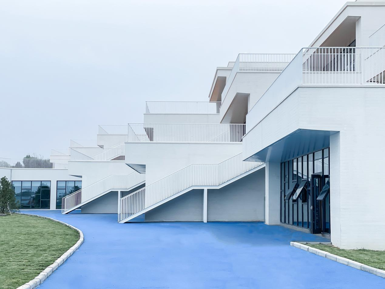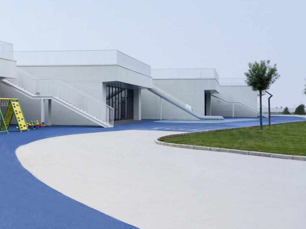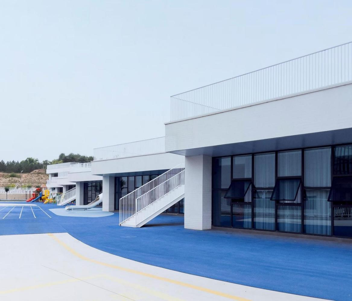 建筑外立面采用白色真石漆作為核心飾面材質(zhì),輔以白色金屬欄桿,形成簡(jiǎn)潔統(tǒng)一的建筑風(fēng)格。場(chǎng)地內(nèi)的綠色草坪與藍(lán)色橡膠跑道色彩層次豐富,既注入自然生態(tài)氣息與活動(dòng)活力,又與建筑外立面形成材質(zhì)、色彩的和諧呼應(yīng)。設(shè)計(jì)以兒童行為需求為核心,打造開放通透、安全舒適的學(xué)習(xí)活動(dòng)場(chǎng)所,孩子們?cè)谶@里自由玩耍、釋放天性。
