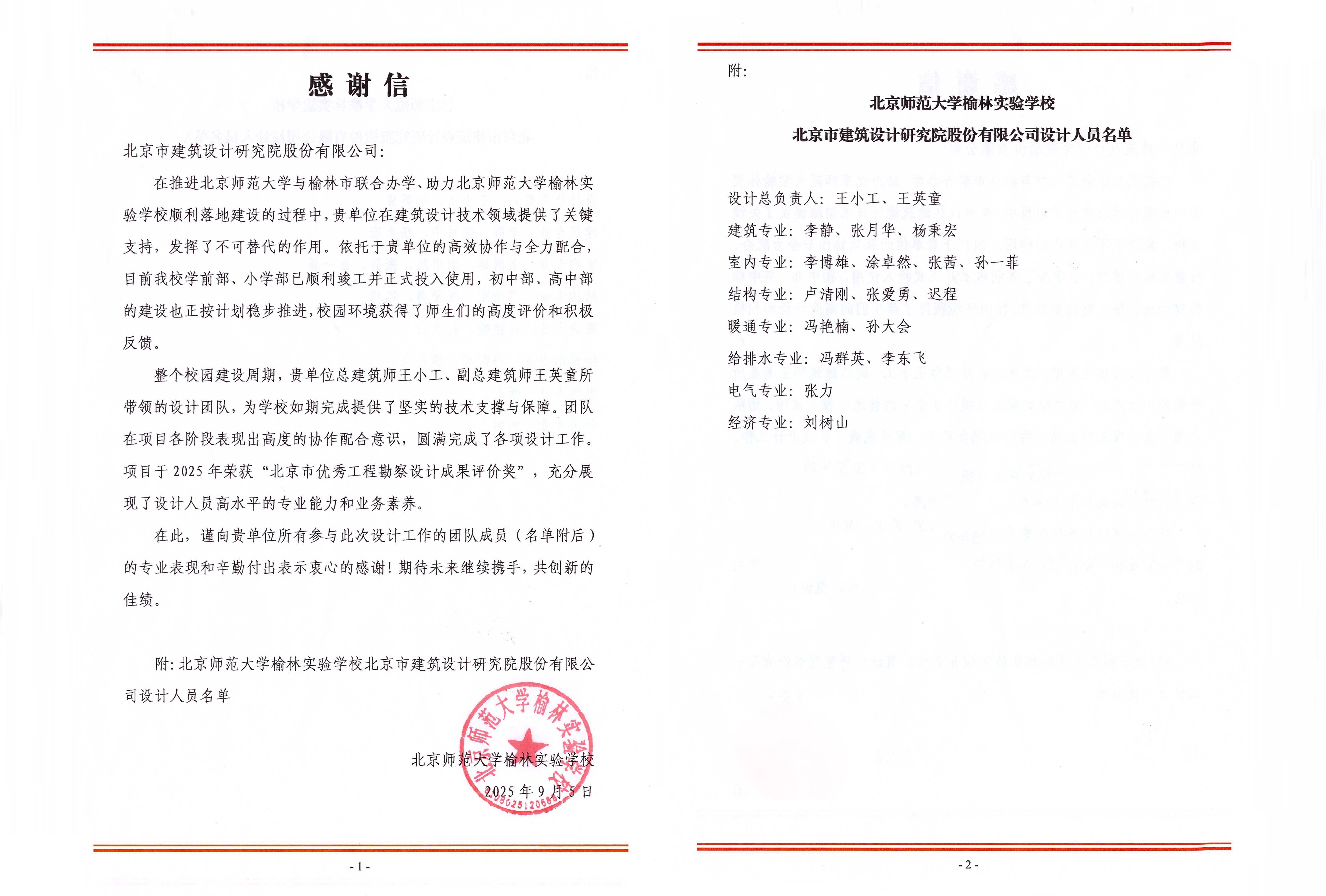 信中對(duì)北京建院設(shè)計(jì)團(tuán)隊(duì)在推進(jìn)北京師范大學(xué)與榆林市聯(lián)合辦學(xué)、助力北京師范大學(xué)榆林實(shí)驗(yàn)學(xué)校順利落地建設(shè)過程中的專業(yè)表現(xiàn)和辛勤付出表示感謝,并向項(xiàng)目榮獲“2025年北京市優(yōu)秀工程勘察設(shè)計(jì)成果評(píng)價(jià)獎(jiǎng)”致以祝賀,對(duì)設(shè)計(jì)人員在整個(gè)校園建設(shè)周期,展現(xiàn)出的高水平專業(yè)能力和業(yè)務(wù)素養(yǎng)給予充分認(rèn)可。