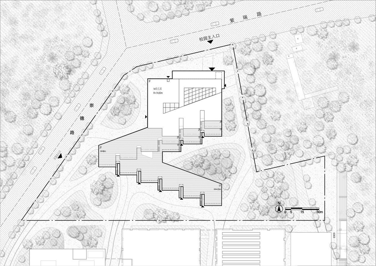 項(xiàng)目位于陜西省榆林市,場(chǎng)地南鄰科創(chuàng)四路,東至居然路,西至規(guī)劃道路,北至紫瑞路。項(xiàng)目用地不規(guī)則,設(shè)計(jì)團(tuán)隊(duì)最大化地利用場(chǎng)地完成總體布局,主入口設(shè)置在北側(cè)道路上,西側(cè)道路設(shè)置應(yīng)急出入口,南側(cè)緊鄰北京師范大學(xué)榆林學(xué)校小學(xué)部地塊,東南角地形高差較大,考慮到土方平衡,利用場(chǎng)地現(xiàn)有地形高差打造梯田式實(shí)踐園地,將園區(qū)綠地景觀與教育理念相結(jié)合,同時(shí)也完成幼兒園和小學(xué)的景觀銜接。