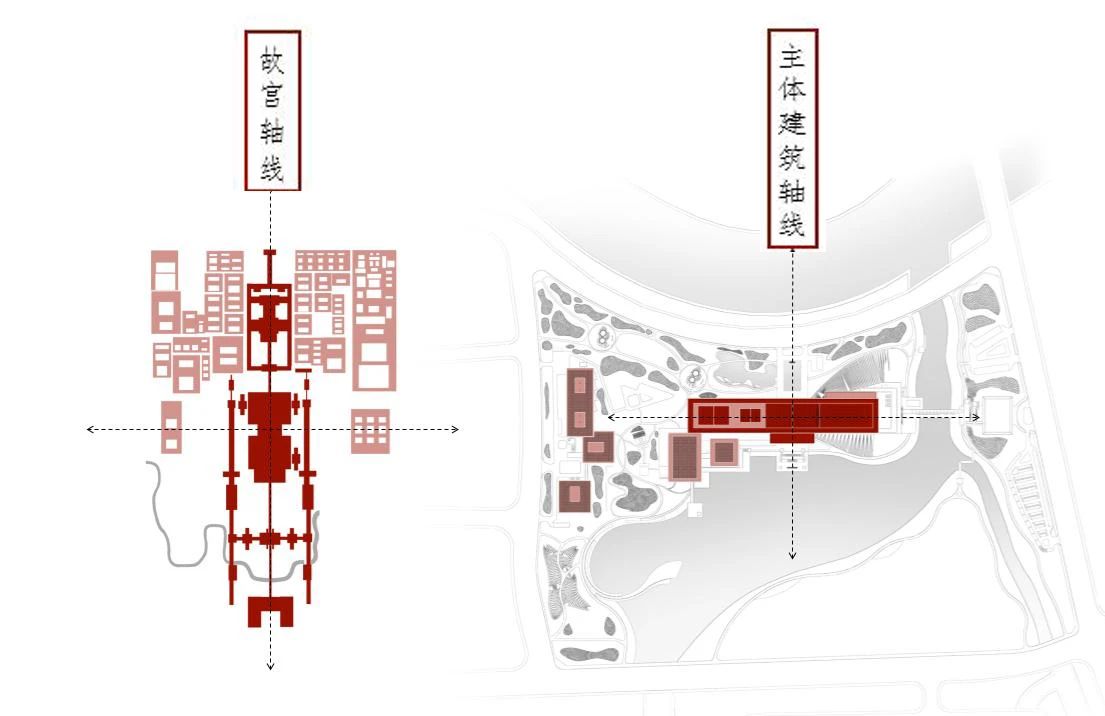 結(jié)合地形條件,在建筑的最終設(shè)計(jì)規(guī)劃中,將對外文物展覽布置在了場地東側(cè),較為私密的文物庫房、修復(fù)及后勤功能則布置在場地西側(cè),最大限度滿足功能布局的同時(shí),也有利于分期建設(shè)。這種南側(cè)臨水、北面疊山的線性格局,也是呼應(yīng)了中國傳統(tǒng)“堪輿”理論的理想布局?!拜S線是形制的根基。故宮有一條中軸線,北院區(qū)的中軸線也是寓意故宮核心‘天際線’。我們想通過這種均衡的軸線布局方式與散點(diǎn)的構(gòu)成邏輯向紫禁城致敬,也是在傳承著故宮的歷史文化底蘊(yùn)?!?/span>