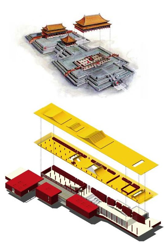 軸線的設(shè)計(jì)靈感來自于哪兒?張宇告訴記者,故宮博物院北院區(qū)所在之處,可建設(shè)用地地塊狹長、形狀不規(guī)則,東西長約900米,而南北最窄處僅60米。在狹長的地形里如何滿足一座現(xiàn)代化博物館的功能?設(shè)計(jì)團(tuán)隊(duì)反復(fù)考量后發(fā)現(xiàn),如果是在西南側(cè)布置主要展覽的話,功能雖集中性較強(qiáng),但總體布局帶來失重感,而且東側(cè)地塊利用不充分,流線過長,對從東側(cè)主要人流的吸引力和體驗(yàn)感不強(qiáng)。