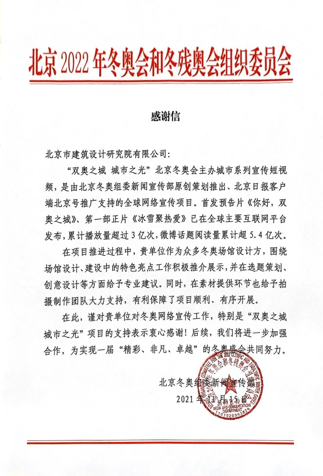 11月15日,北京冬奧組委新聞宣傳部發(fā)來(lái)感謝信,對(duì)北京市建筑設(shè)計(jì)研究院股份有限公司在冬奧網(wǎng)絡(luò)宣傳工作,特別是“雙奧之城 城市之光”項(xiàng)目中給予的支持表示感謝。