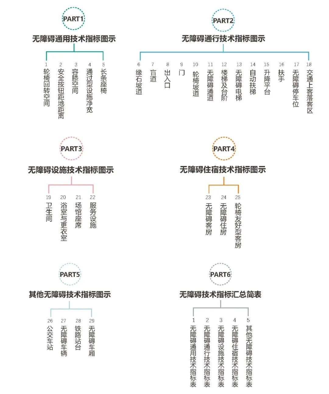 《北京2022無障礙圖冊》共分為六個部分,可與《無障礙指南》的內(nèi)容相對應(yīng)使用。
