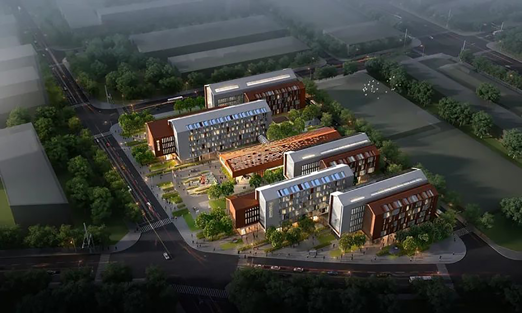 作為老舊廠房更新改造項(xiàng)目,首旅怡禾酒店將保留廠區(qū)原有的工業(yè)風(fēng)貌,立面采用銹紅色與混凝土材質(zhì)搭配的玻璃幕墻,主體建筑采用4至6層坡屋頂交替布局,使原有工業(yè)設(shè)備和廠房煥發(fā)新生。場(chǎng)地設(shè)計(jì)延續(xù)了設(shè)計(jì)小鎮(zhèn)毯式街區(qū)理念,開放場(chǎng)地綠地景觀,北側(cè)與城市綠心公園形成緊密聯(lián)系,南側(cè)延續(xù)云鳳路一公里城市活力帶界面,助力設(shè)計(jì)小鎮(zhèn)綠色友好慢行空間連續(xù),打造融合型、開放性街區(qū)。